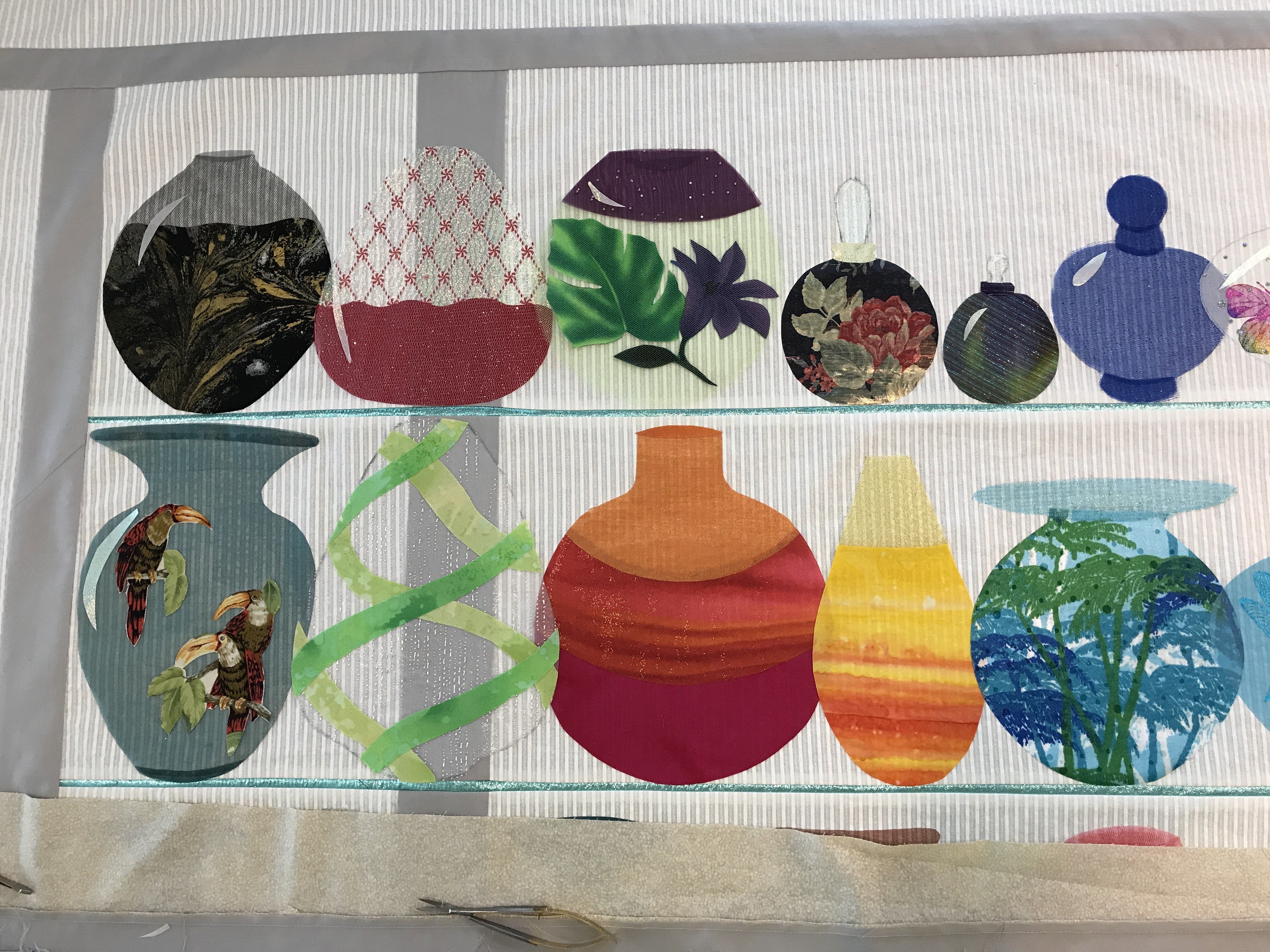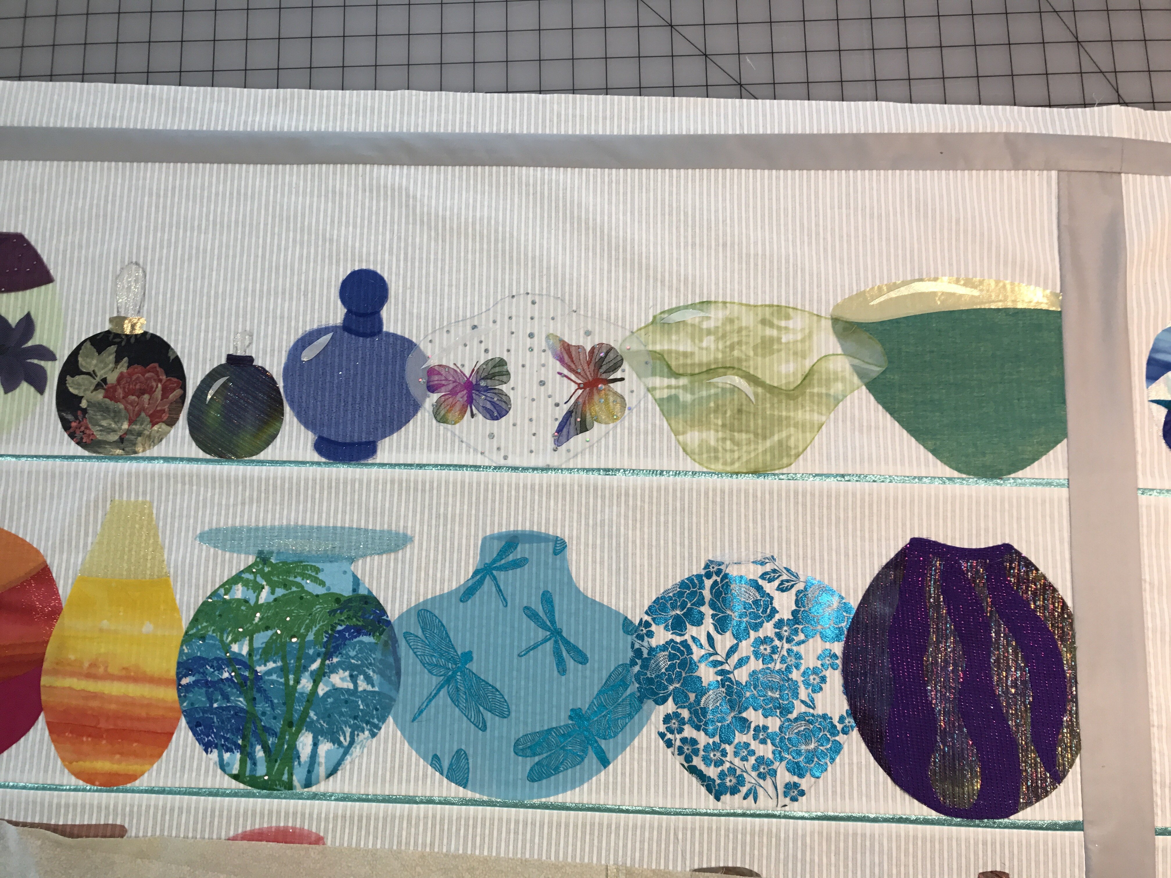 61 1/2” w x 68 1/2” h Original design using EQ7, pieced, and raw-edge appliquéd. The cabinet is 100% cotton fabrics. The glass pieces are many different fabrics including satin, shiny & glitter tulle, organza, crinkle sheers, metallics, and more. Nylon Tulle covers the raw-edge appliques. Longarm quilted, computerized and hand guided, with Poly, Cotton, MonoPoly, and Metallic threads. Hobbs silk batting for trapunto and overall.