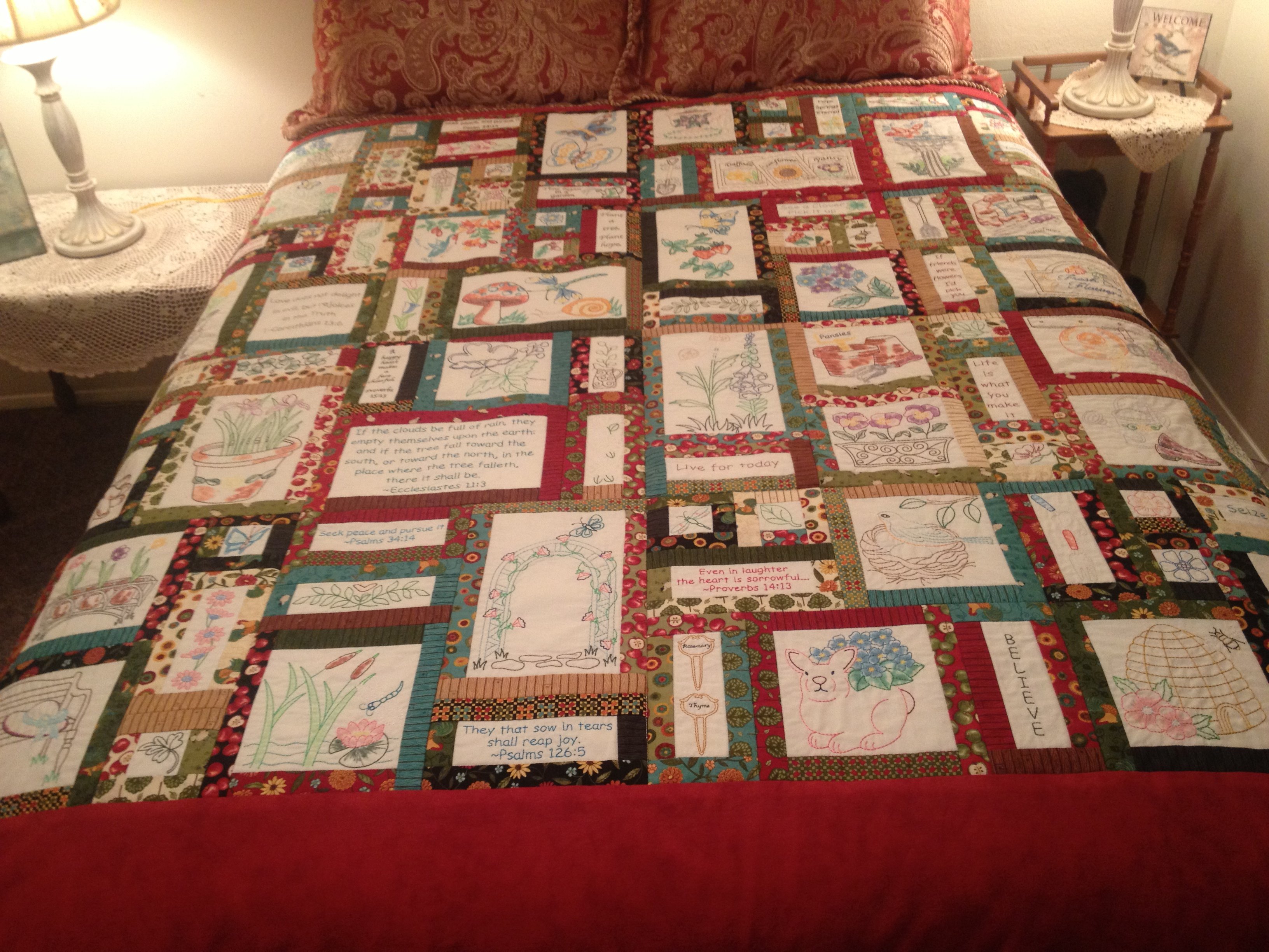 Queen size machine embroidered quilt made for church auction. Hand painted with Copic paint markers.