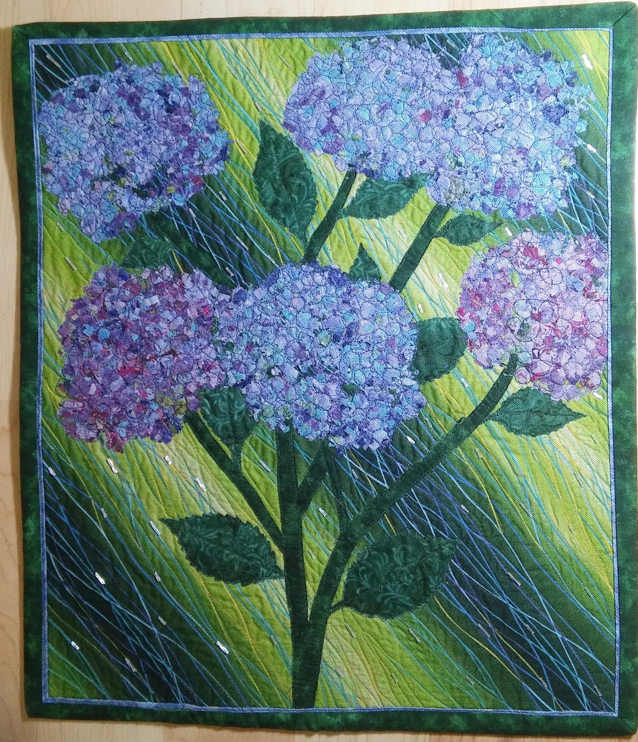 I had nurtured my hydrangea plant for a couple of years and finally had blooms on it when a heavy rainstorm hit. I was worried that I might not have any petals left with the hard rain, and went outside during a lull in the storm to see that the blossoms had survived. It inspired me to make this art wall quilt using a snippet technique to form the flowers. It is covered in tulle and machine quilted. I then hand beaded it using clear bugle beads to simulate the rain.
