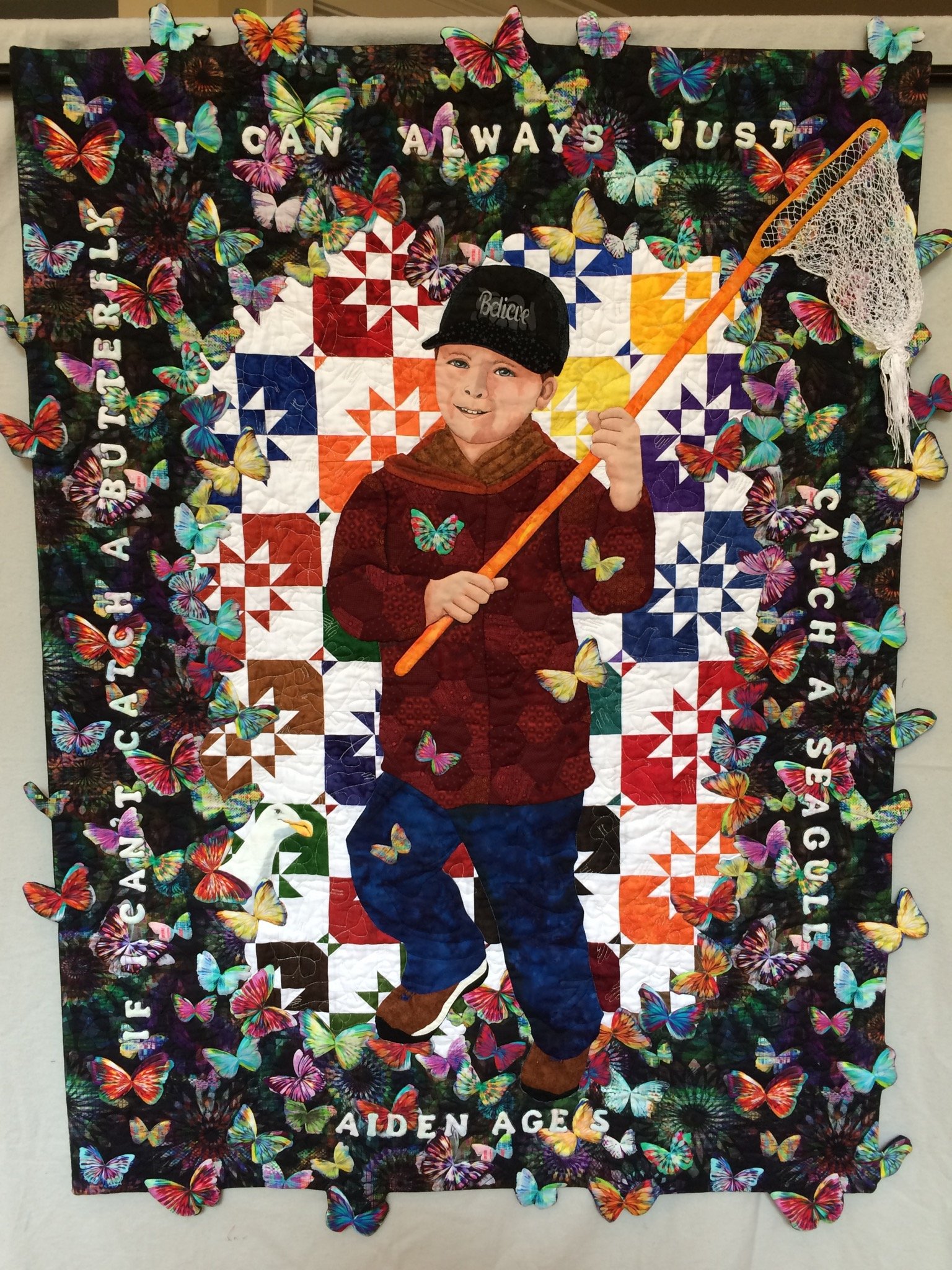 This is a quote from my grandson Aiden as he tried out his new birthday gift. 5 year olds believe anything can be accomplished. A photo from that day was my inspiration. I painted the face and hands and the quilt is hand appliqued. I also hand macraméd the butterfly net so that it would flow free. As the appliqued boy was being assembled it hung on my design wall next to another partial pieced project, I noticed how well the disappearing hour glass fit with the image and the theme. At age 13 Aiden thinks the statement was silly.