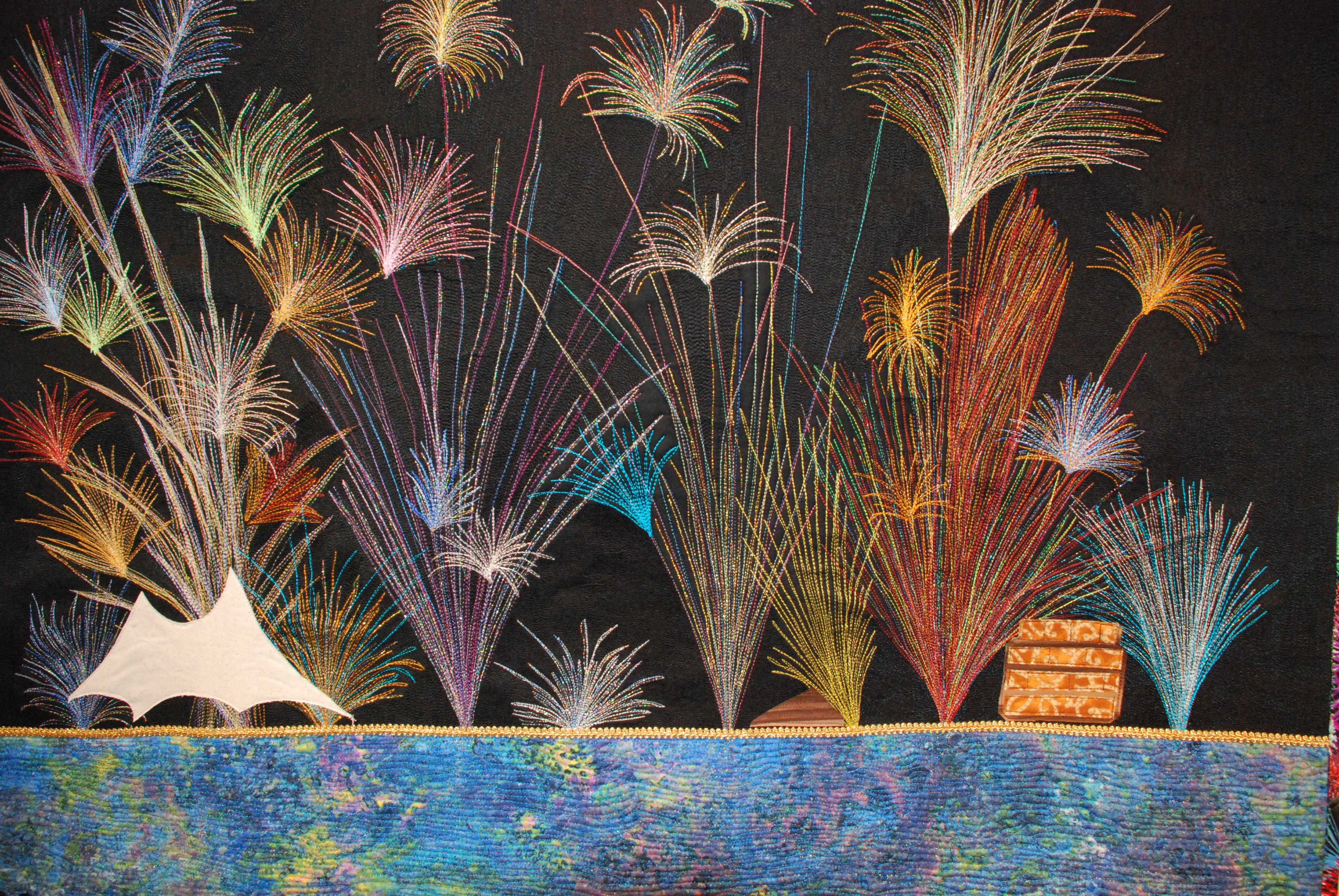 I have always wanted to use thread painting to depict fireworks. This piece won "Best of Show" in a challenge at a local art gallery in Sault Ste. Marie, ON Canada in 2015. It uses local landmark references such as The Roberta Bondar Pavillion tent and our city hall. The threads I used were Sulky Rayon and Holoshimmer threads for the fireworks.