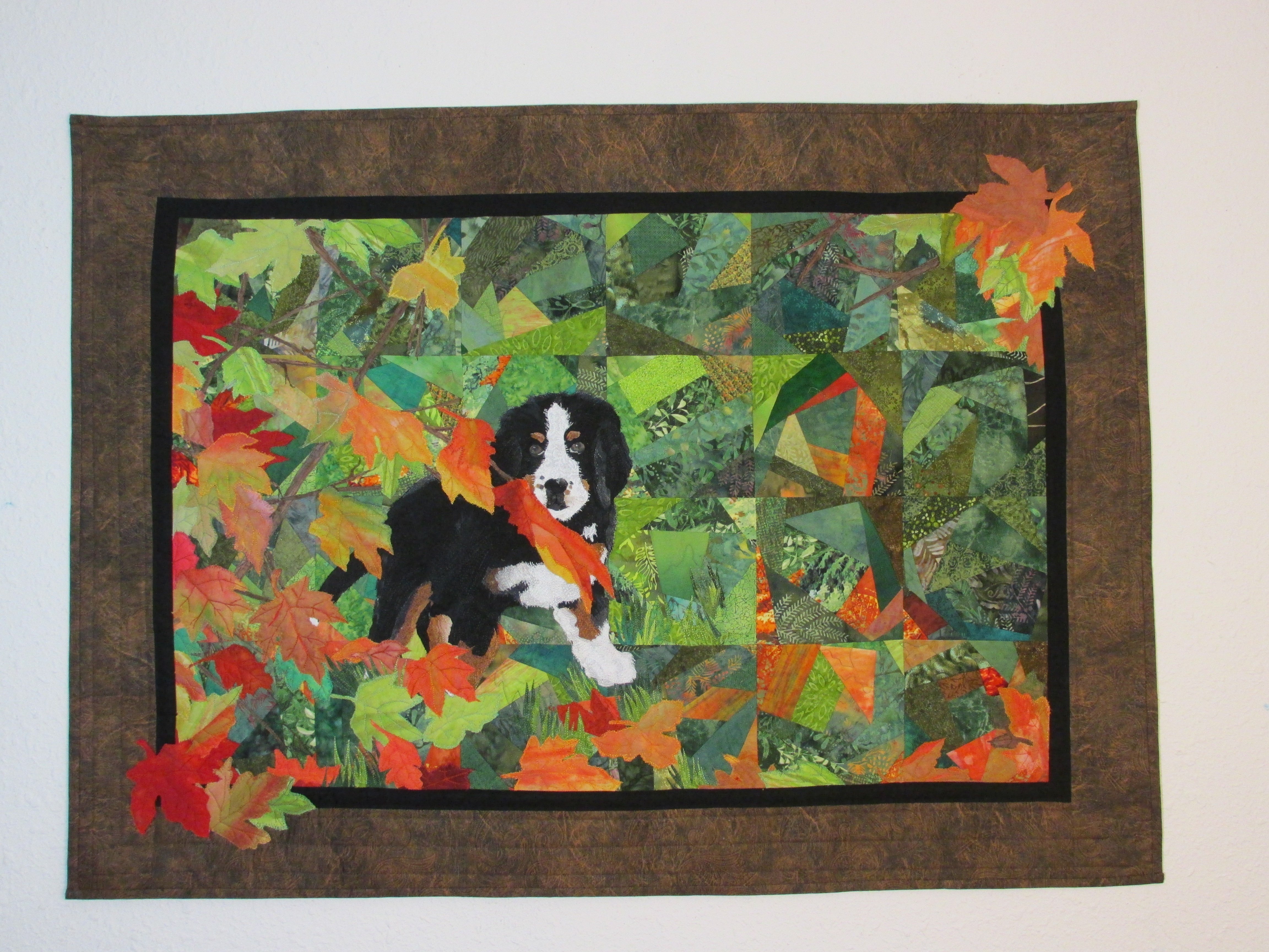 This was inspired by my Berner puppy Casey's first walk in the fall leaves. Background is crazy pieced with batiks. The leaves are from the fabrics I paint in the hot summer months. His body is raw edge applique. I used 40wt. rayon for the thread painting and the leave background.