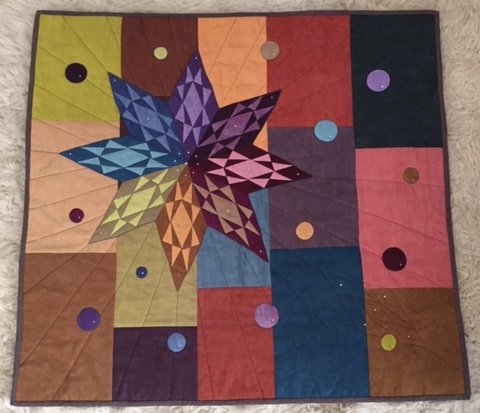 Paducah came about because of a stash of Cherrywood fabrics purchased in Paducah. My Guild had a challenge to do something with the Ohio Star block. I chose to make the block a diamond based on a show of Cheryl Malkowski quilts. The diamonds are paper pieced and then appliqued to the pieced background. I love circles and needed to add some of these using the Karen Kay Buckley perfect circles templates. I feel this quilt is a modern success and it also got a first place ribbon in its caategory at our show the end of June 2018.
