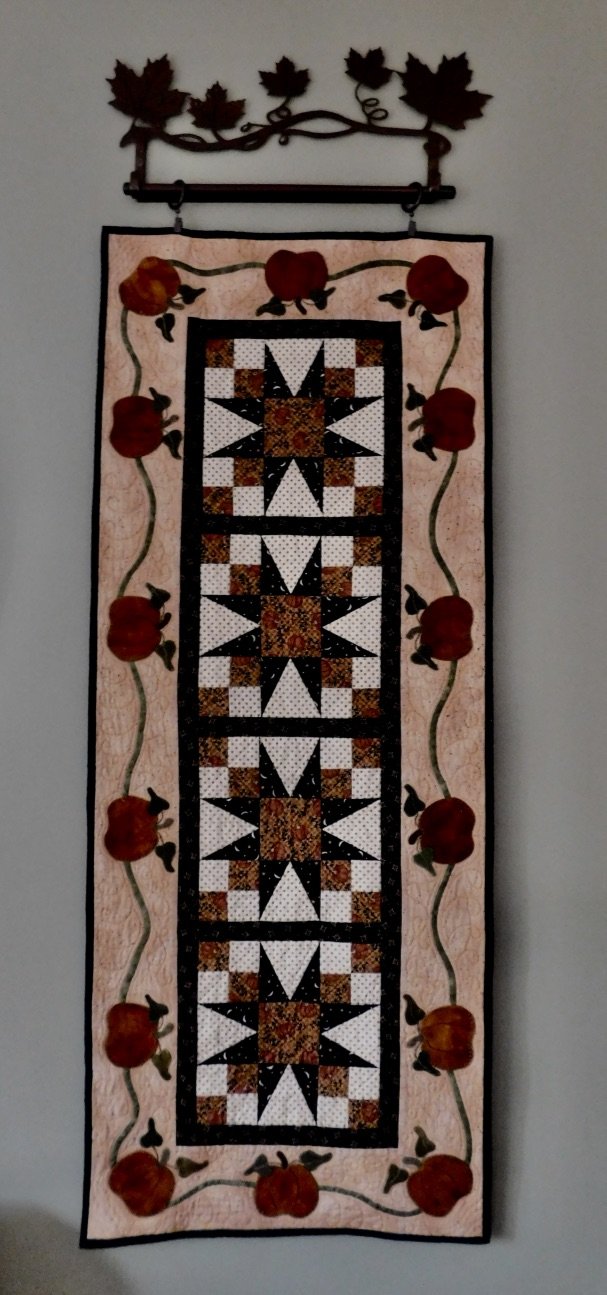 This table runner is the result of a day of play in my quilt room. Having nothing particular in mind other than to try the V block ruler by Deb Tucker of Studio 180 Designs (no affiliation), before I knew it I was appliqueing wool pumpkins to the border. This was such a fun project to work on. I hope a day of play is in your future too!