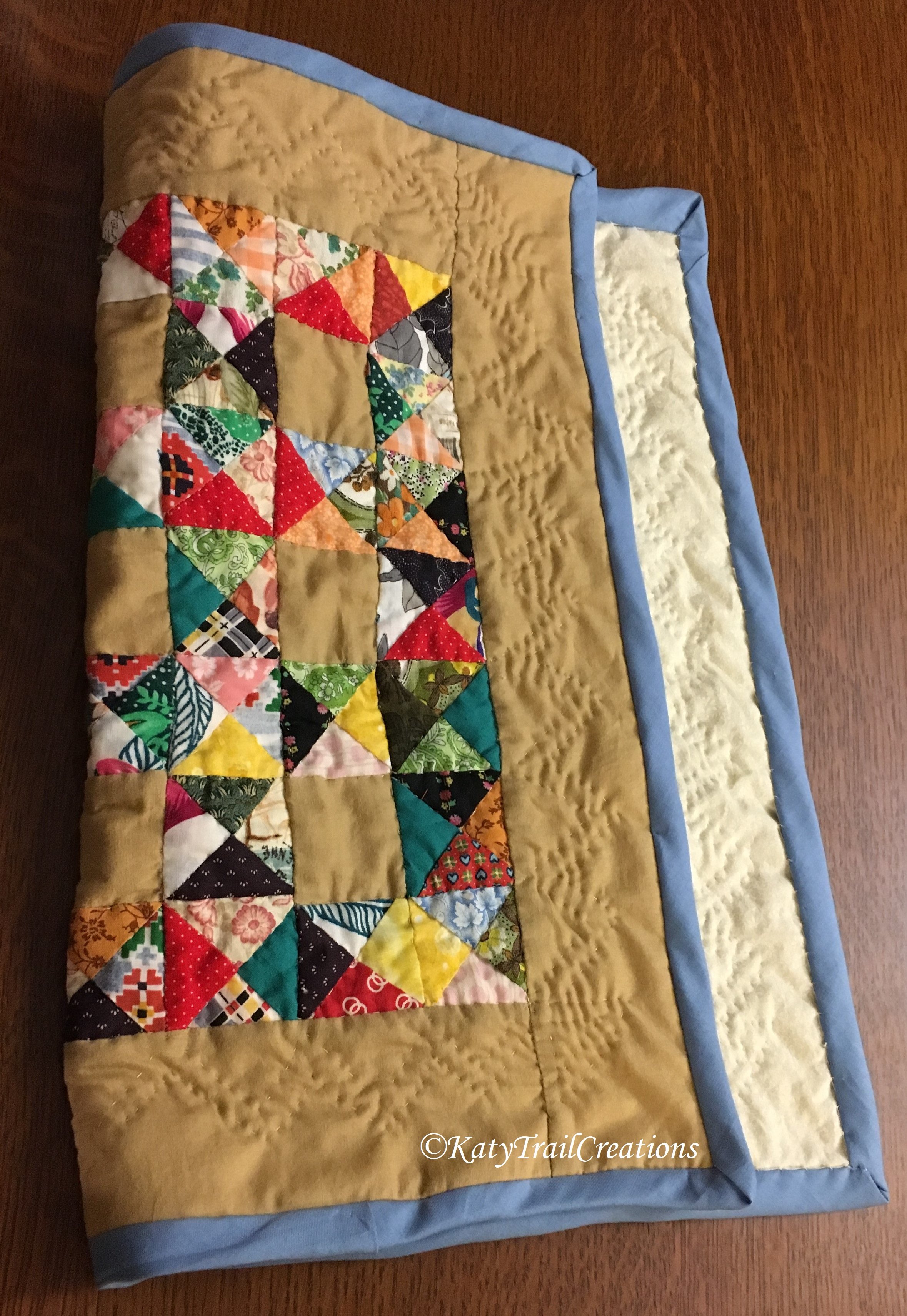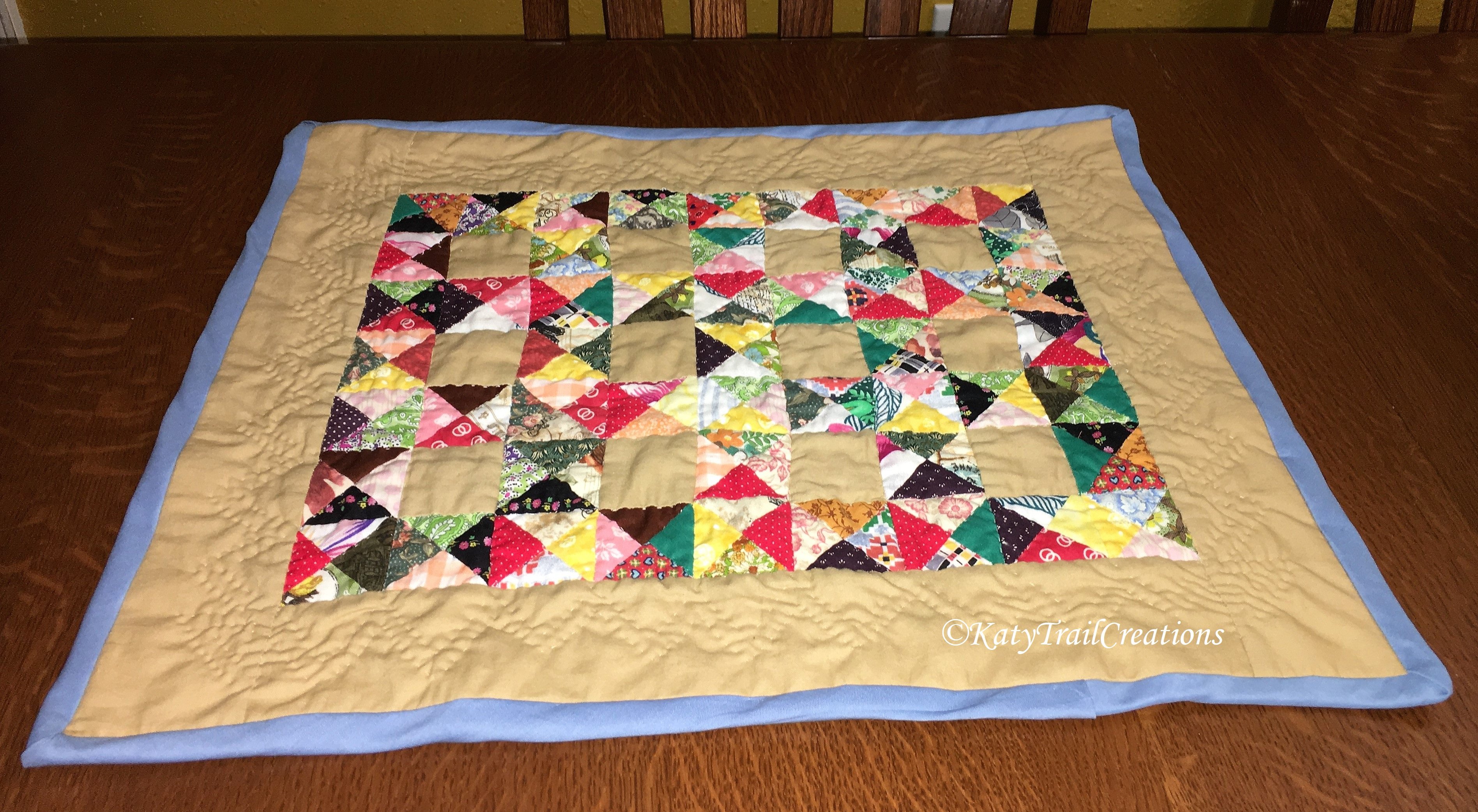 This was a miniature version of a magazine pattern using some scraps to create a splash of color inside this tan border. I used the baby blue binding as a reference to blue skies on a day in the park. It measures 19 1/2 by 16 1/2 inches.