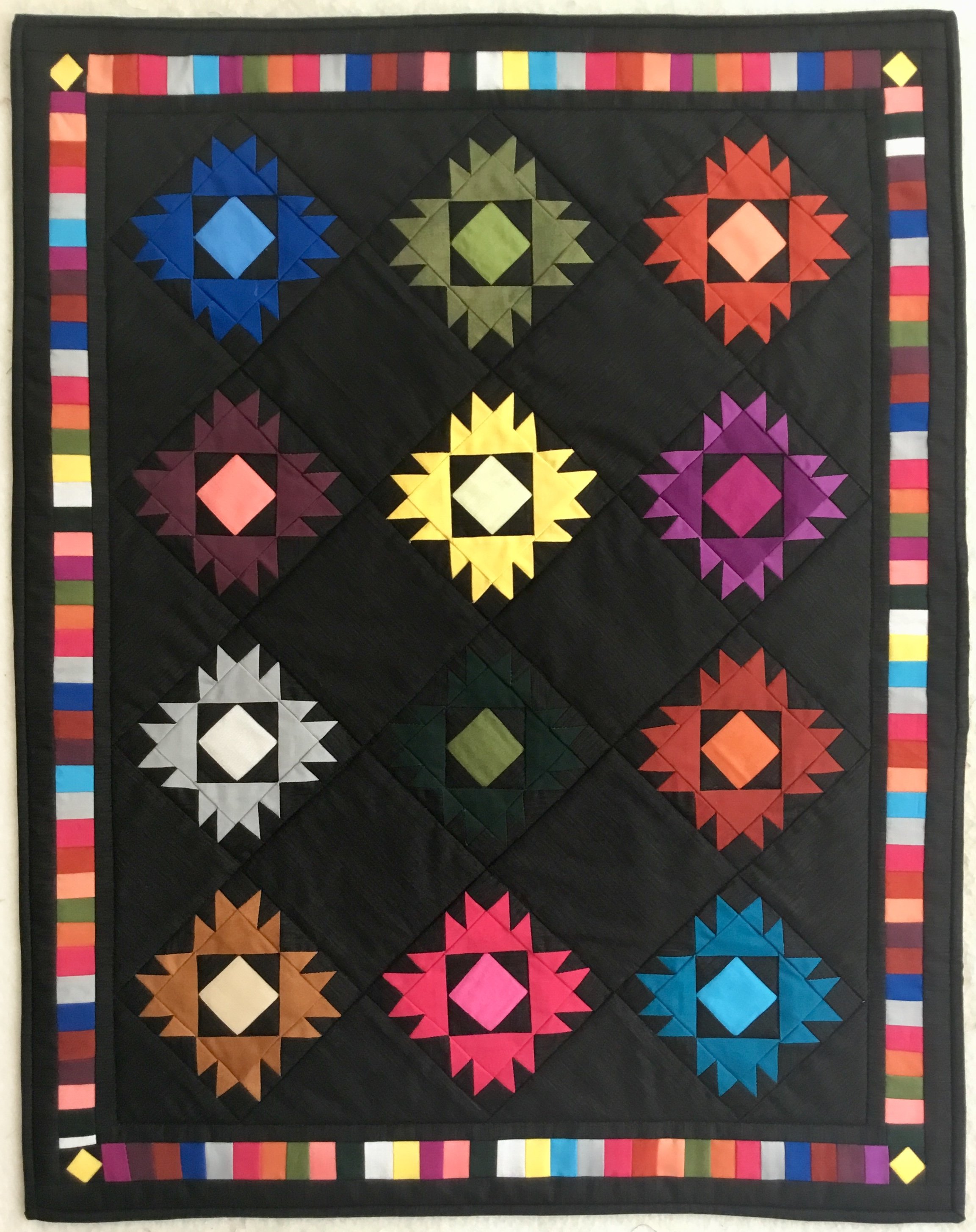 My name is William Kane. My wife and I own a quilt shop in Berkshire County, Massachusetts. I have always wanted to make a miniature quilt but didn’t know what type. A friend of ours had made a full sized Amish quilt and when I saw it I knew this would work as my inspiration. When I joined the IMQE I now had the incintive to start ( and finish)! My IMQE partner, Elaine White, had told me she liked “some color” and I thought this project would have great color and contrast as well. The project was more challenging that I thought it would be as it used fairly small pieces (3/8 inch half square triangles, not paper pieced). I ma now in thhe process of making one for myself.