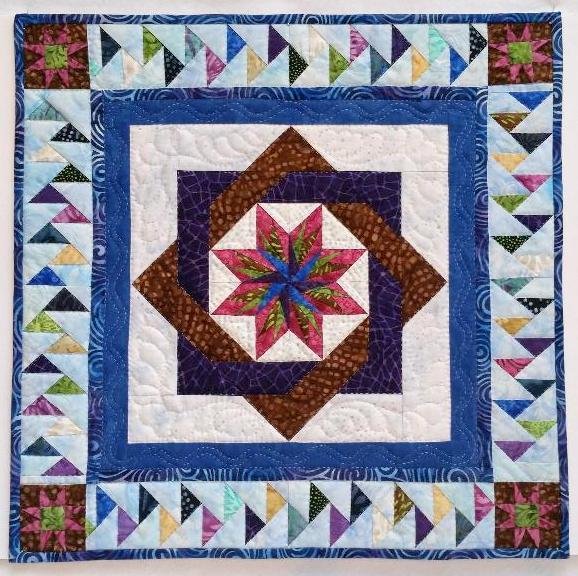 We decided to use the same collection of batik fabrics so our quilts would complement each other. However, our quilting styles would be "the salt in the soup" that makes each one special. I have combined a traditional star block with an untraditional paper pieced star, along with flying geese and hand quilting and named it "Finding North". Finding our way to friendship, understanding, and sharing in our love of quilting.