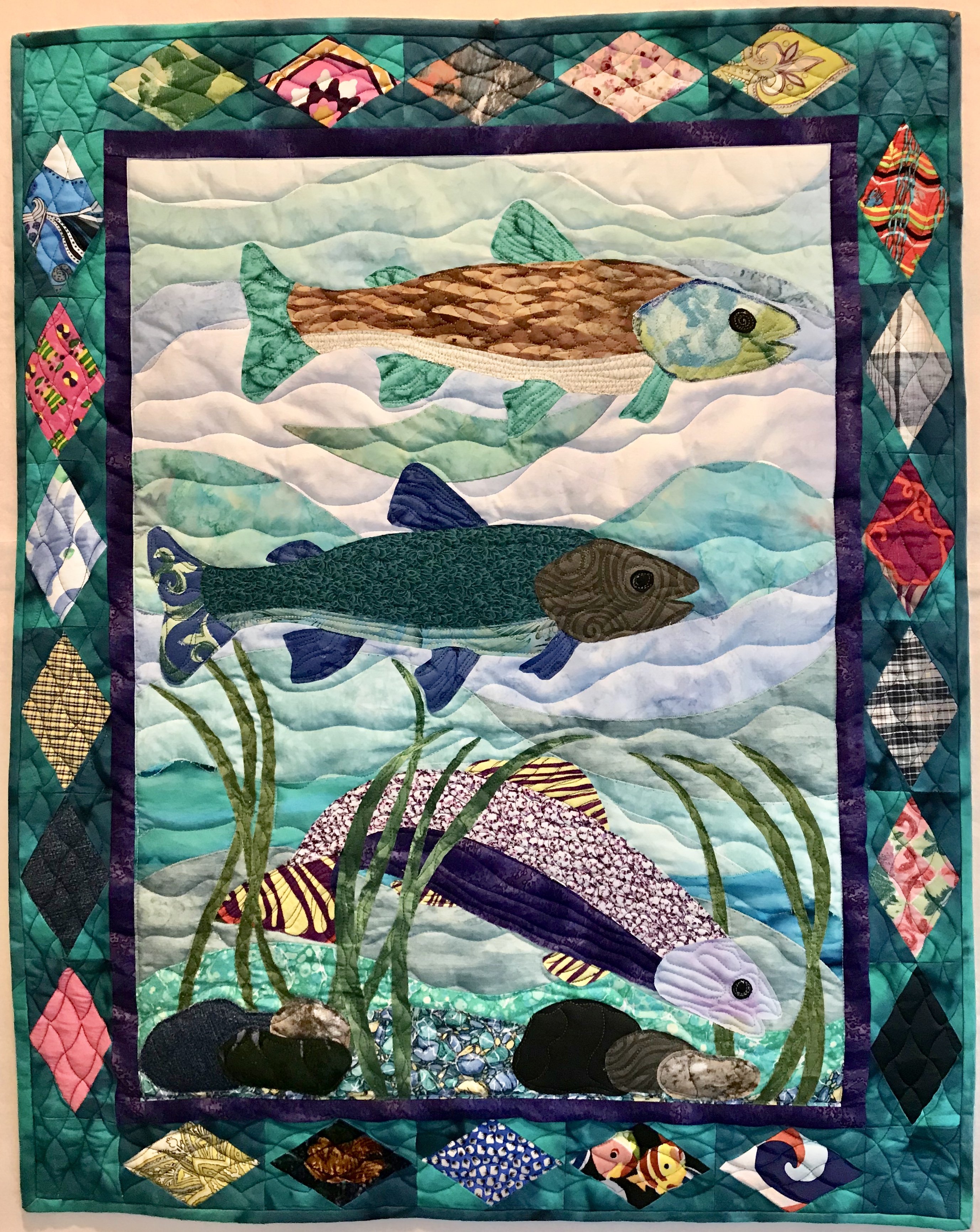 Custom design, raw edge applique on a pieced background, paper-pieced diamond border. 26.25" w x 34" h.
