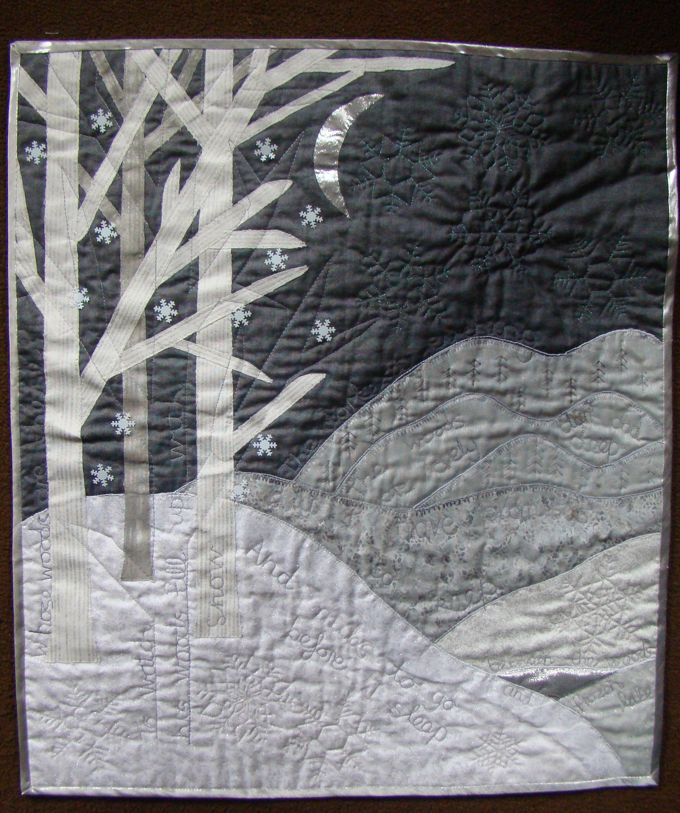 We write often…..and very early on we decided that we wanted to link our little quilts in some way. We narrowed our ideas down to 2…..but we couldn’t decide between them. Finally we went with both. We have been swapping blocks on a sewing/quilting theme…..4 so far, each time making identical blocks…one to send and one to keep! For the IMQE we took as our theme…..what turned out to be both our favourite poem….Stopping by Woods on a Snowy Evening by Robert Frost.