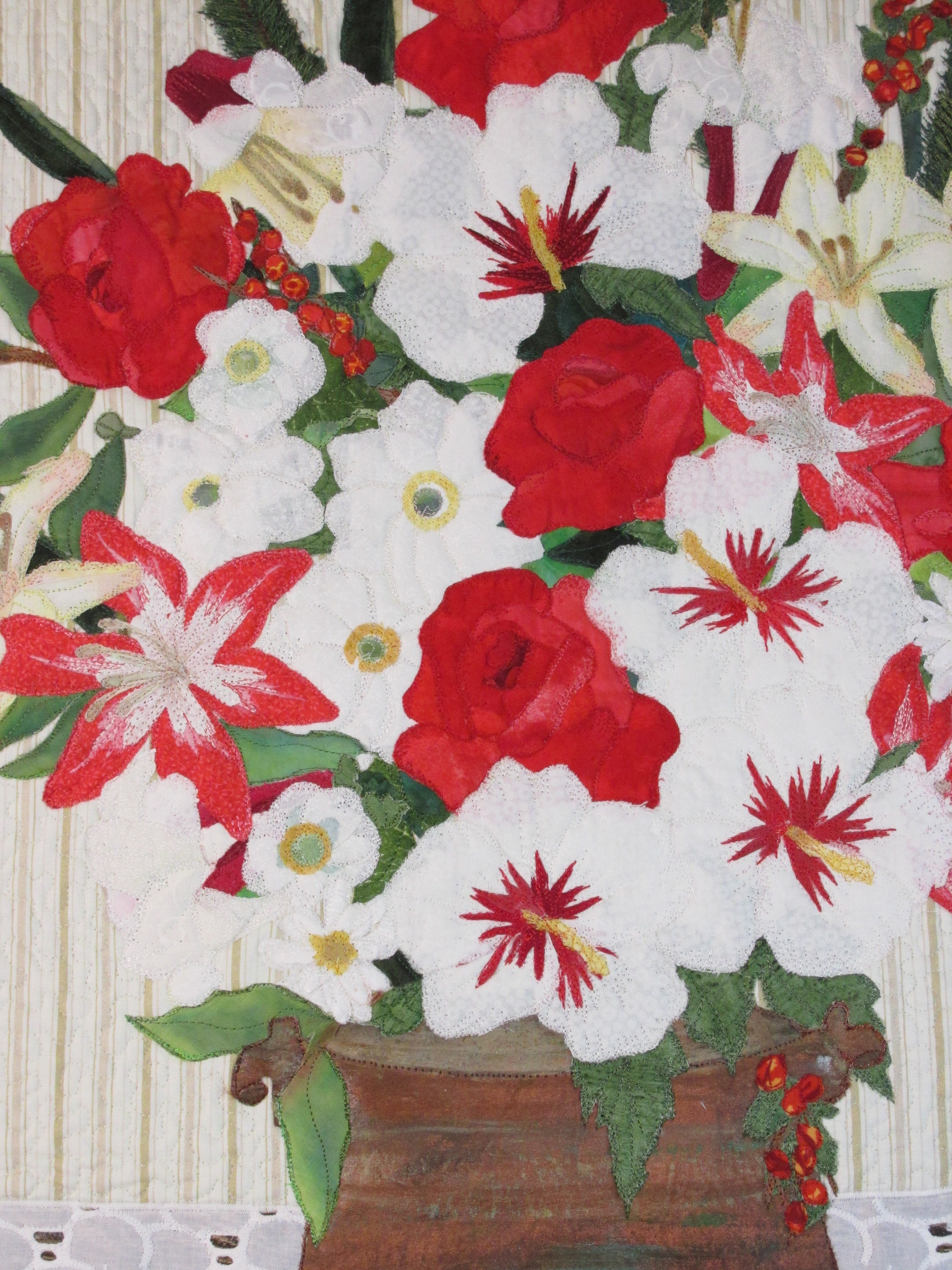 Holiday Vase This is appliques of the flowers in my gardens. I wanted a picture to put up on my dinning room wall for the holiday season. I painted many of the fabrics to get the blends that were needed. The candy in the dish is machine embroidery. On the flowers I did a lot of thread painting.