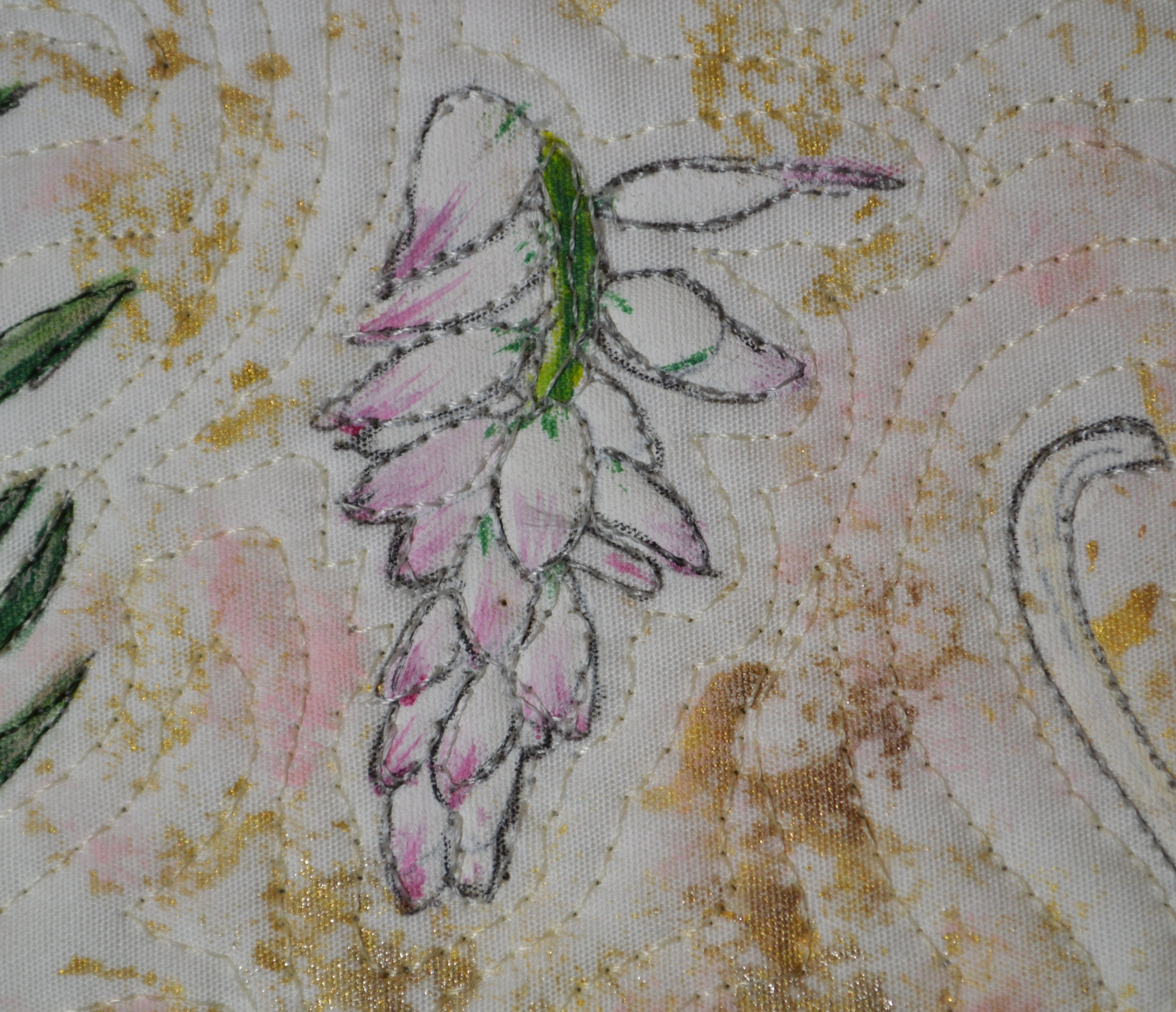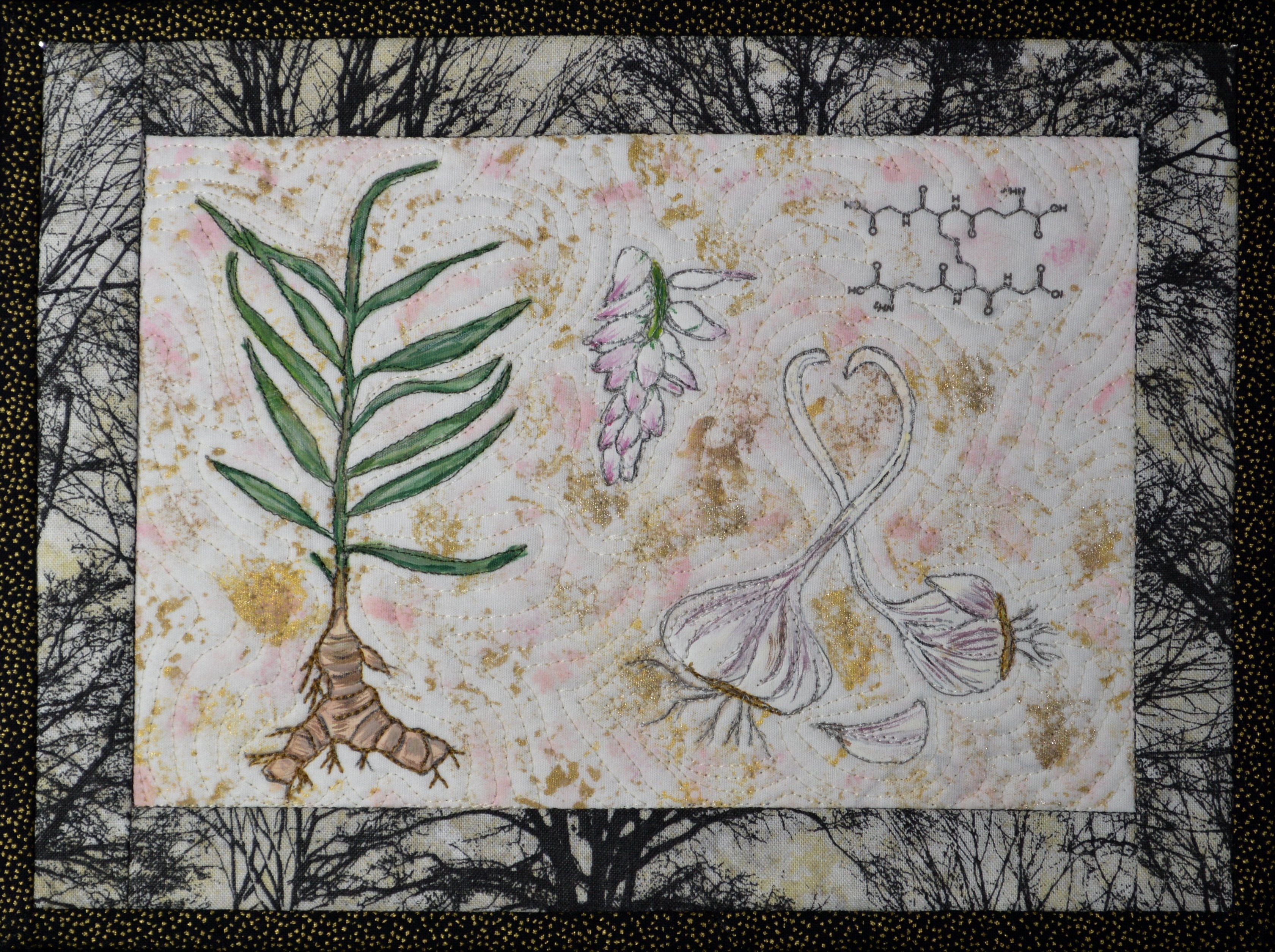 “G” is a quilt from the sub-series “Lemon- Aide with a Twist of Lyme” part of the “52 Yarns of Lyme – The Lyme Dis-Ease Series by Susan L. Jaenen-Griffin. Included in the sub-series are 26 quilts that utilize over 75 different techniques. I created these quilts while attempting to relearn the techniques that I had lost because of Lyme. Each quilt refers to myriad of treatments that I was undergoing at the time I created them. The following is the artist statement for the quilt “G”