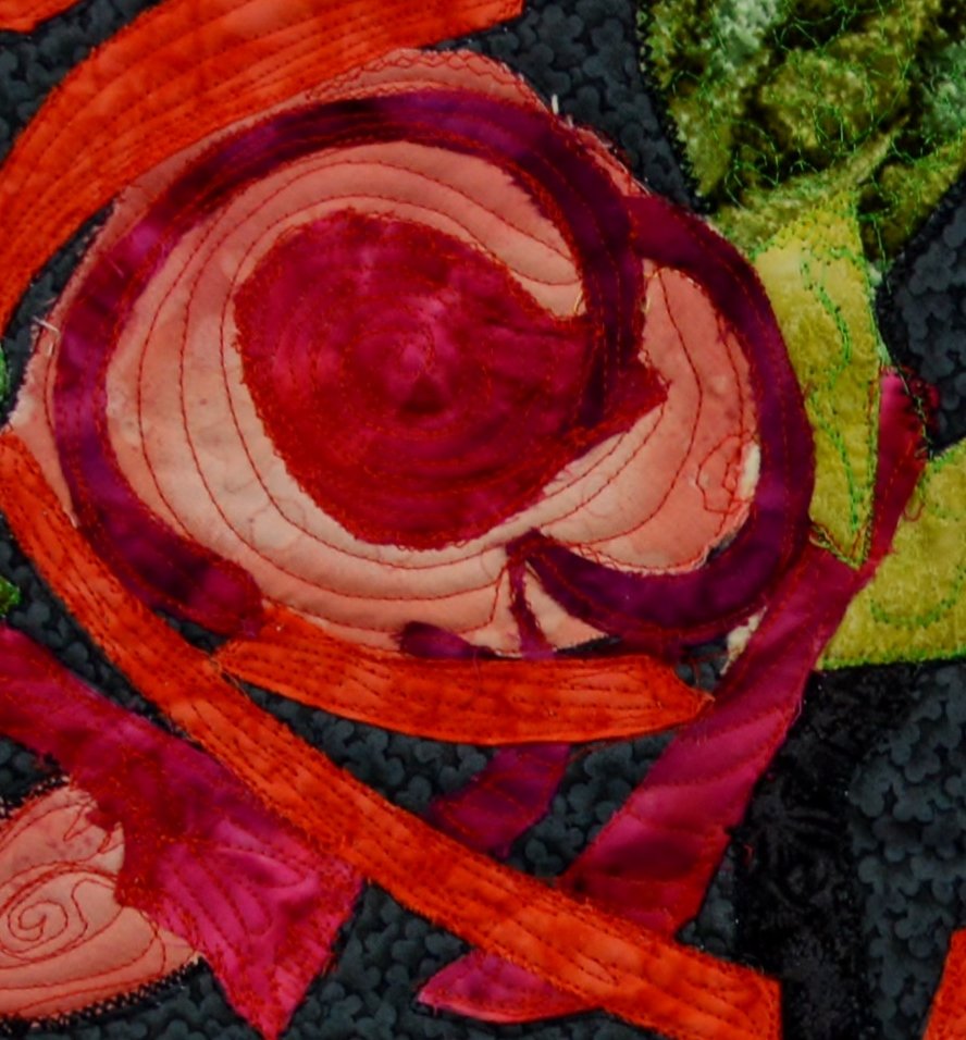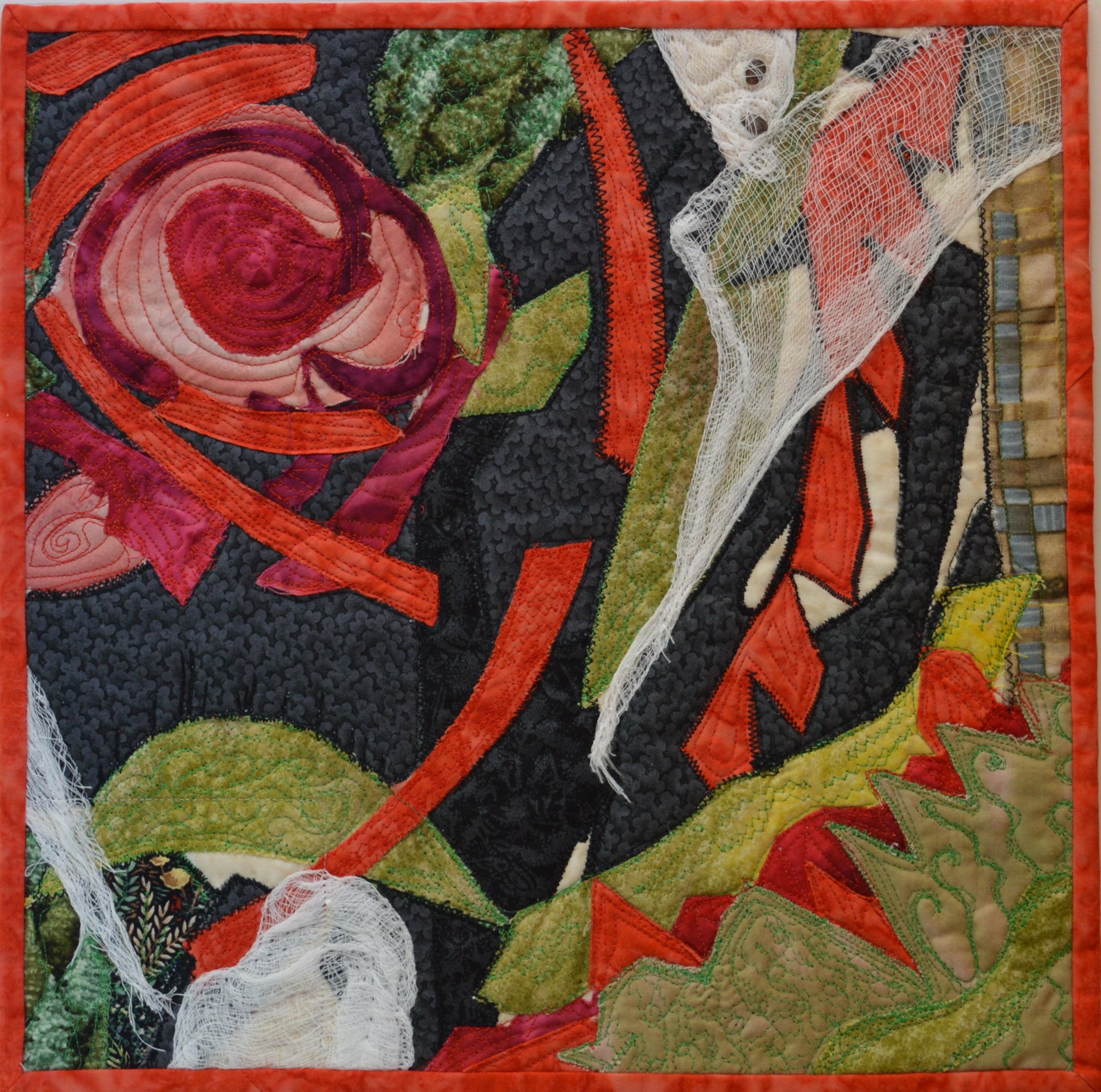 Fabrics are used in this quilt to express the rage of the EM rash which is only the beginning of worse things to come. Medical journals report that the presence of an Erythema Migrans Rash is “sufficient to make the diagnosis of Lyme” however; it is the controversy around the treatment and the bigger issue of the long term consequences of Lyme that is the real storm.