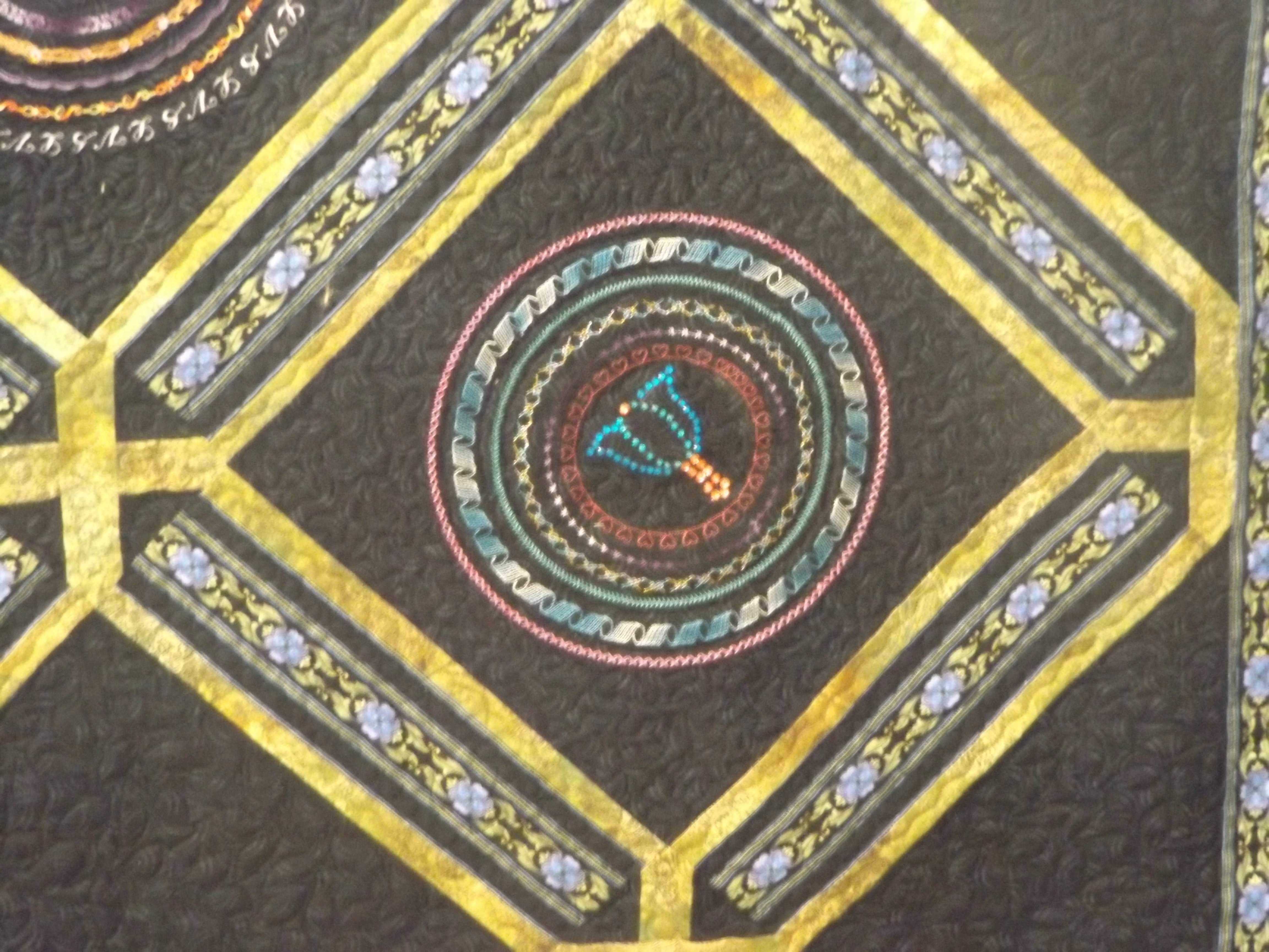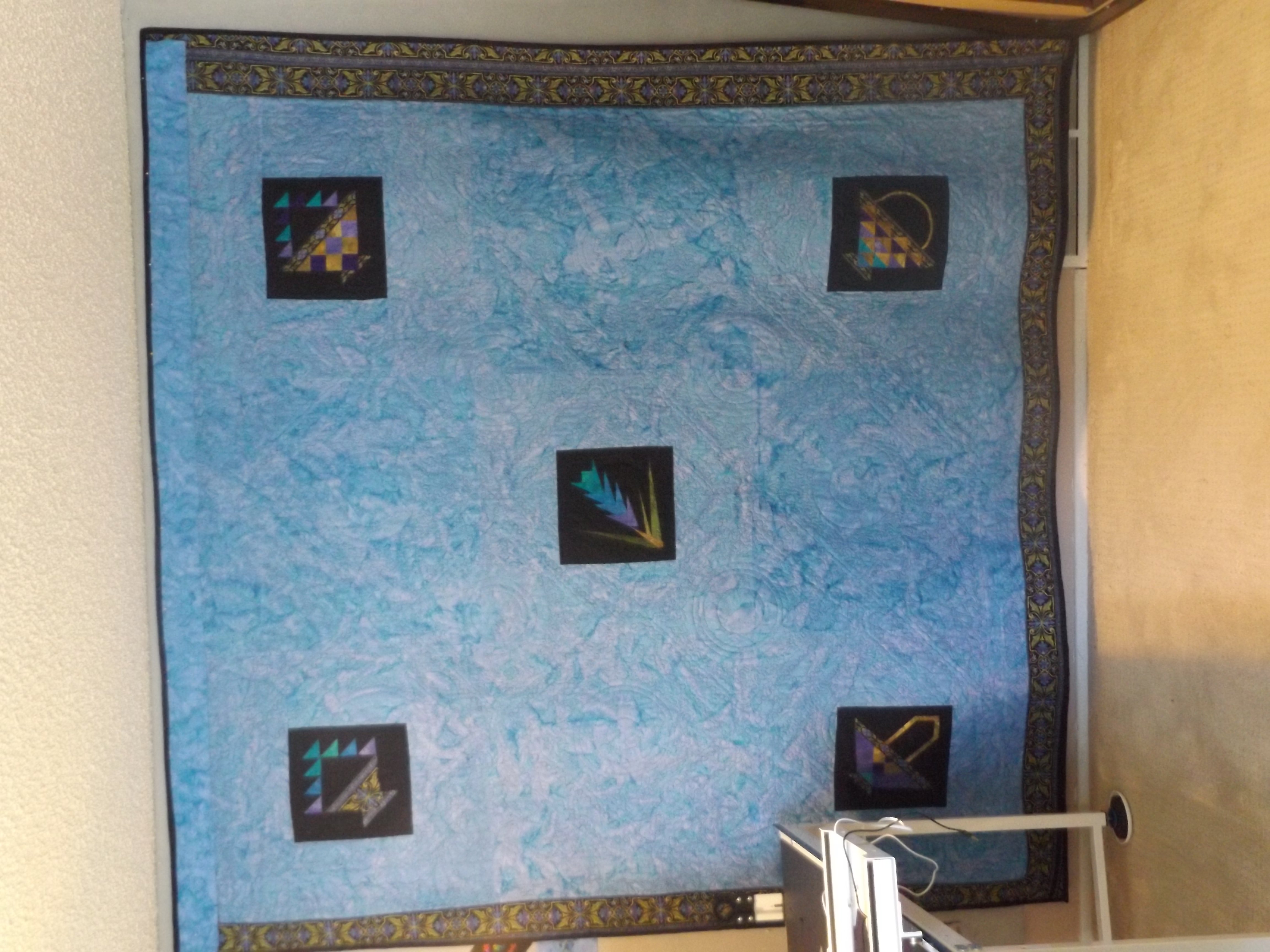 This quilt was a class on Craftsy. It is a Jinny Byer fabric and pattern. I change the basket blocks to a block using all my machine designs using a circle attachment. It was machine stitched and commically quilted. The backing had 5 of the basket blocks from Jinny Byers pattern and fabric. It measures, 85" square.