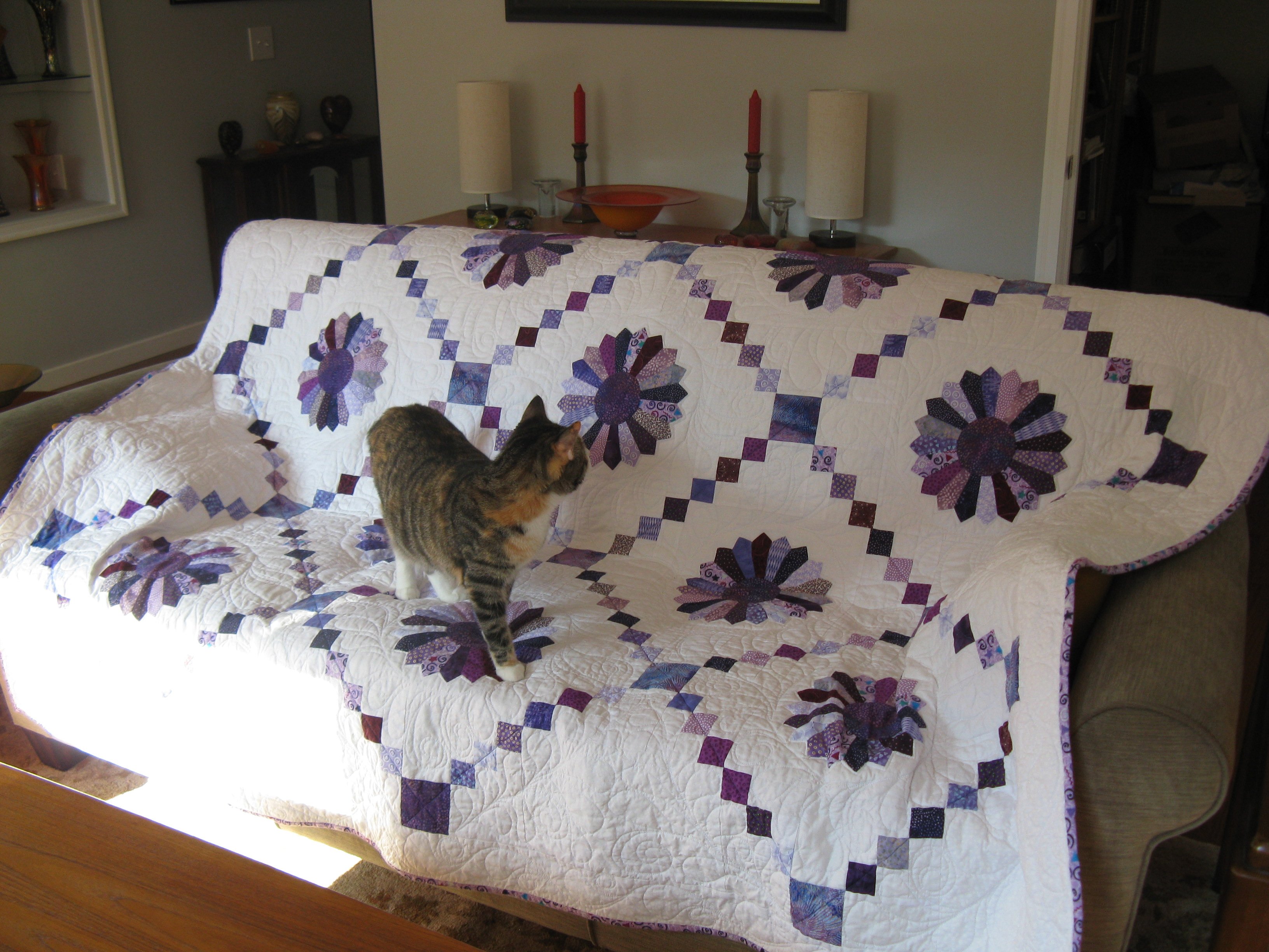 This pattern was posted on Moda. I really liked it and had been wanting to do something with the purples in my stash. I purchased the white fabric. I machine pieced the plates together for the Dresden plates and then hand appliqued the plates to the white backgrounds. The center circles are also hand appliqued to the plates. Rita Sanders beautifully quilted paisley designs all over. This was donated to the Friendsof Arrow Rock, Missouri, for a charity auction. The kitty is our cat whose name is Dancer. She loves to sit on quilts,especially when they have just come out of the dryer.![]()