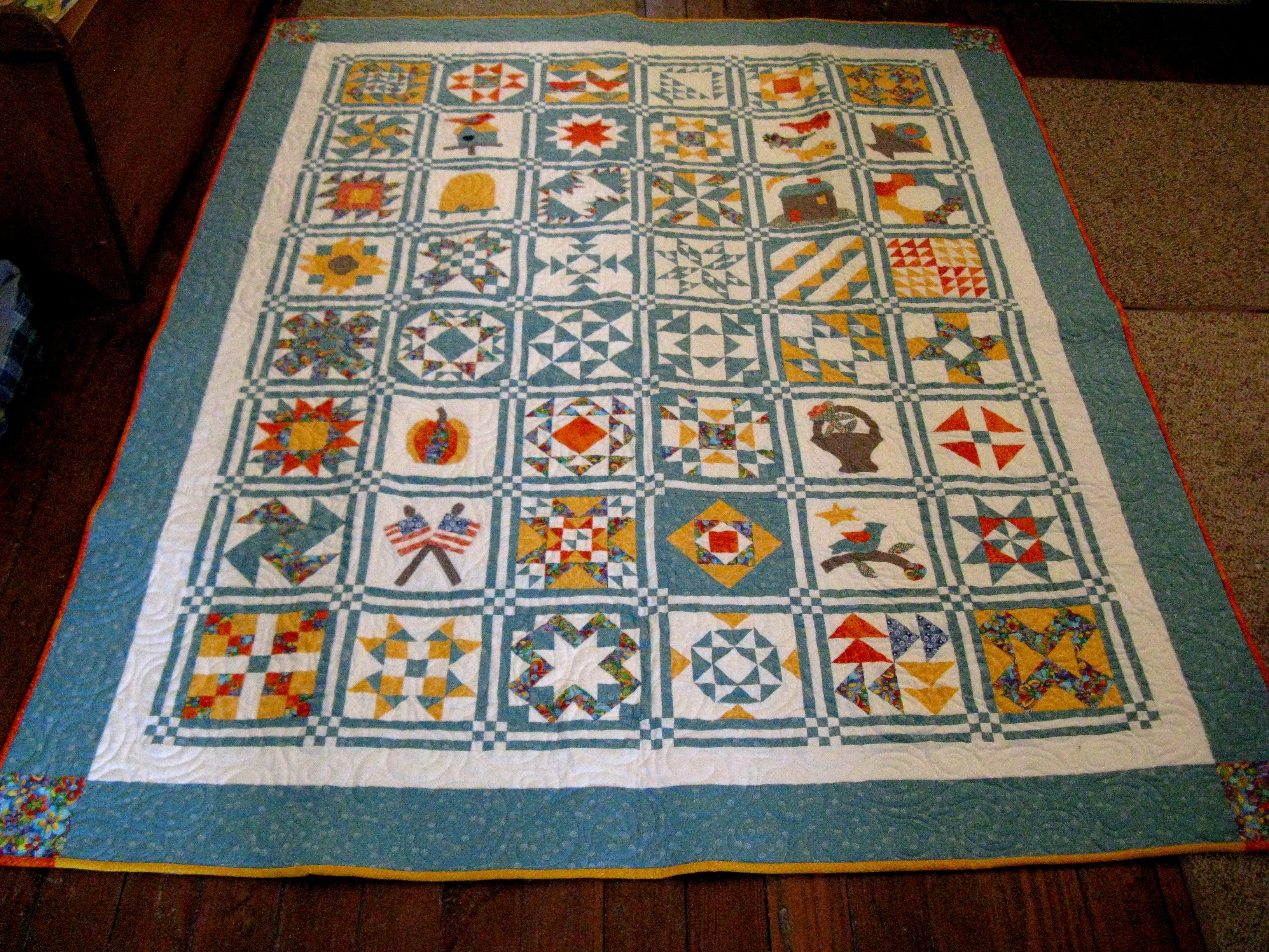 This quilt is Moda Blockhead's #1 quilt. Moda challenged 6 designers to come up with blocks (48 in total). A 6 1/2 inch block was sent out every week. No setting instructions were provided so I found a design I liked in the photos file of the Blockheads Facebook page and adapted it. Rita Sanders quilted it with an overall design. I didn't have enough of one fabric for the binding so I put one color on the top and bottom and then used another color for the sides and wrapped it around the corners to meet the top and bottom. These smaller blocks are fun to do and challenging for piecing. Plus the small appliques were easy and good practice as well.