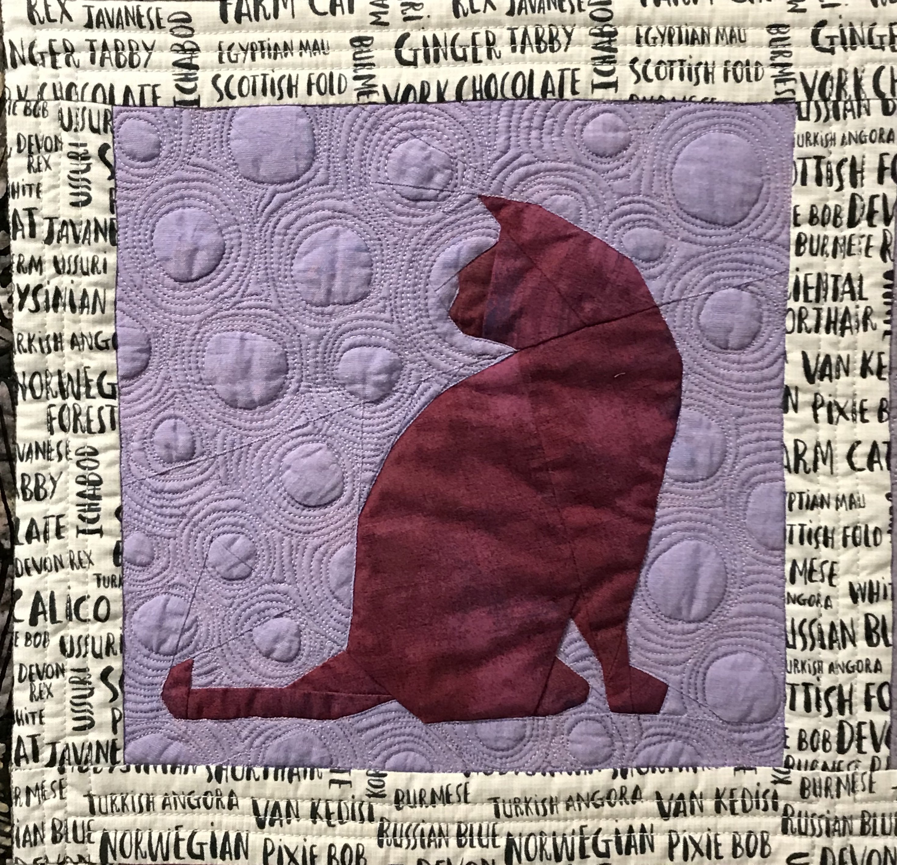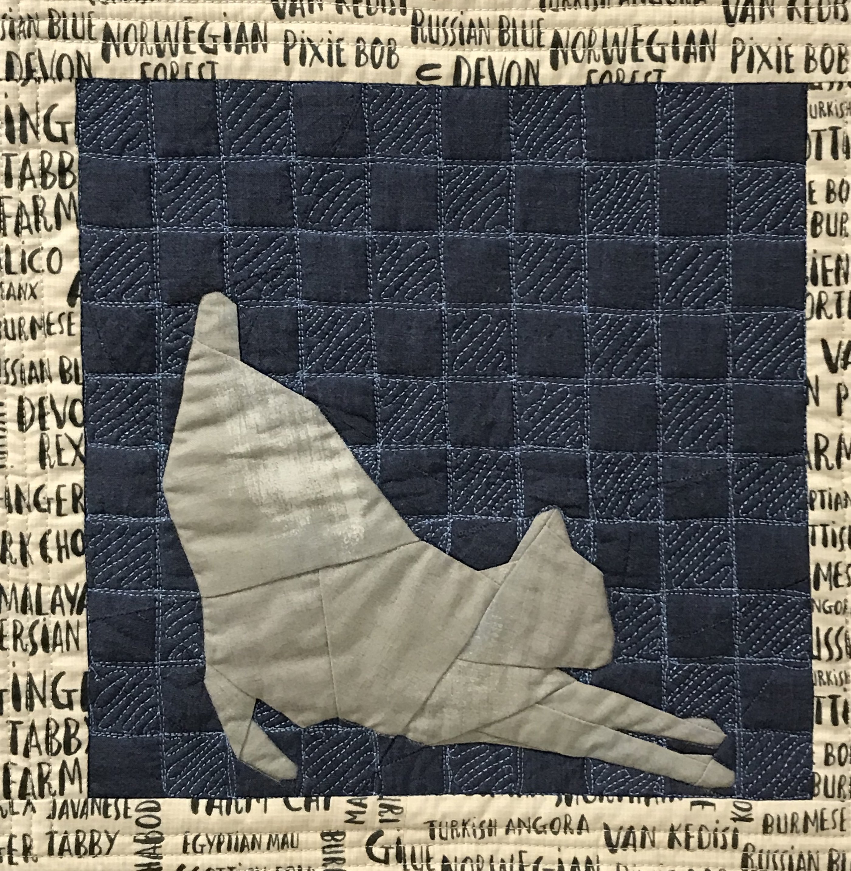 The 34x34 inch wall hanging was made for cat-loving friends and commemorates their white bob tail cat. It was designed in EQ8 and uses paper-pieced cat silhouette designs by Janeen van Niekerk https://quiltartdesigns.blogspot.com/ (purchased on EQ8 store) and slightly modified to bob Max’s tail. It was machine pieced and free-motion quilted by me using some designs inspired by Lori Kennedy. Binding is machine finishing using my signature couched Perle cotton method.