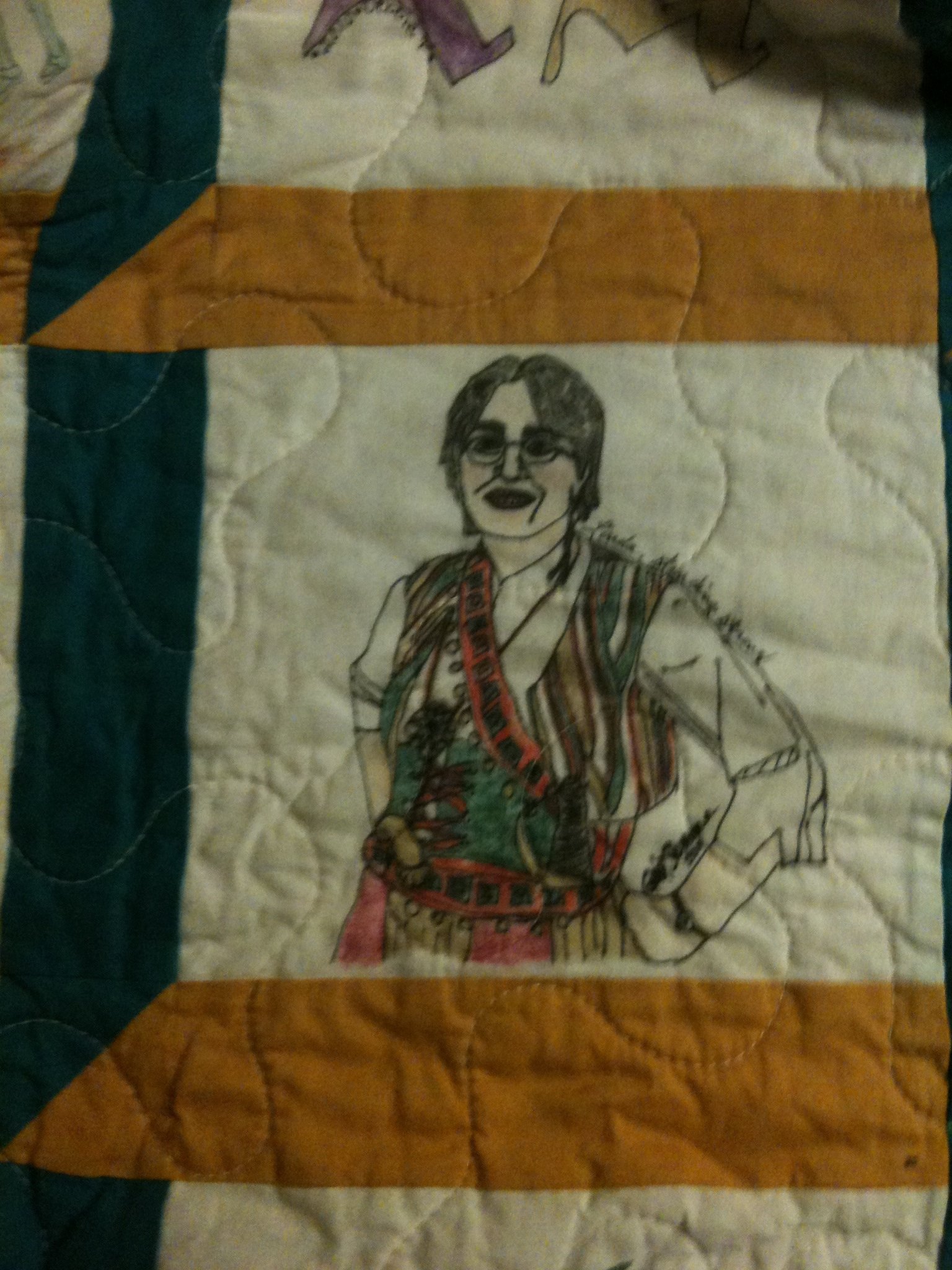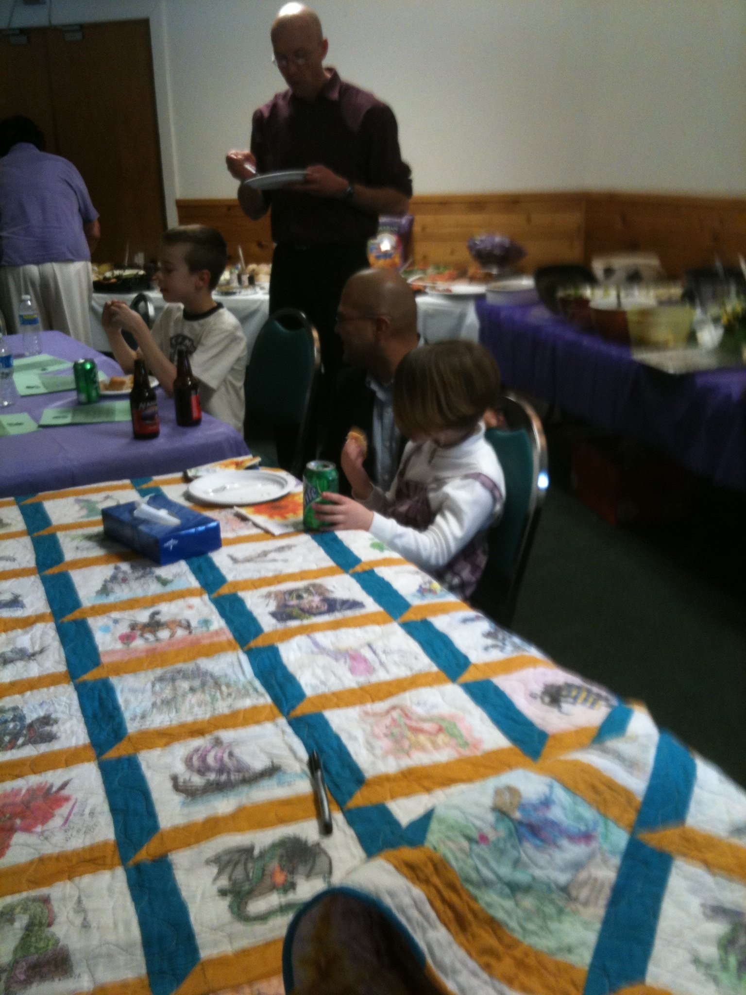 This was a group project for one of our dear midwives who was diagnosed with leukemia. I designed the quilt, prepped all 80 blocks and put it all together. Our department (Labor and Delivery) staff helped to color each block. I could have used a lot more, but ended up with a queen-sized quilt as it was. The pattern I chose was attic window. All blocks were colored with Crayola Crayons, then heat set. It was quilted by PM Quilting in Palmer Alaska. The quilt was eventually sent to Seattle for Linda Aldous who was undergoing treatment. Unfortunately she never got to see it. It arrived a day before she passed. We all liked to think Linda knew it was there and that we cared so much for her. This photo was taken at her memorial service with family and friends. Those that did not get to make or sign a block got a chance to not only see the finished quilt but sign it and send well-wishes. Her family received the quilt.