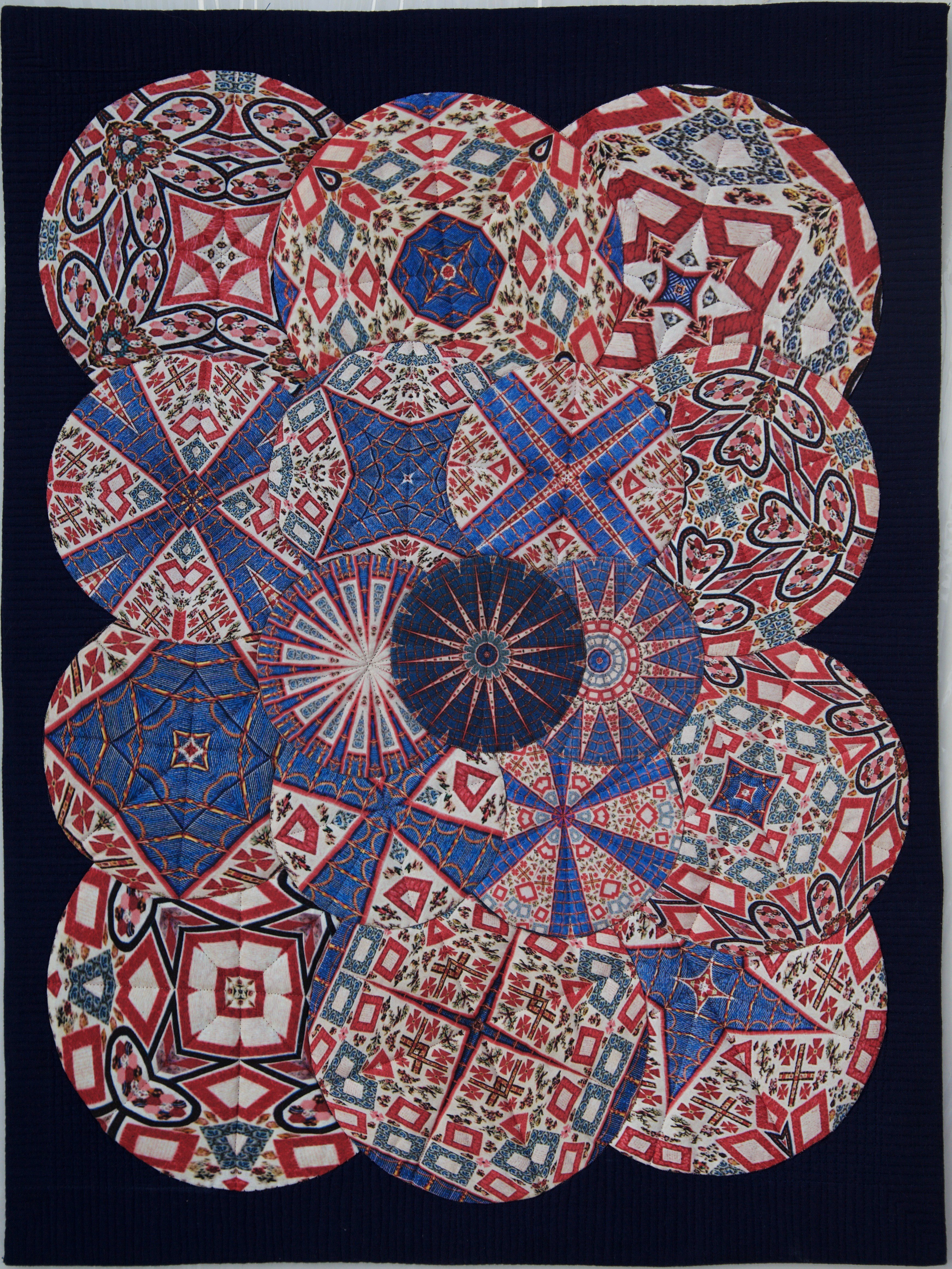 Made for the Re-Vision challenge of the Quilter's Guild of the British Isles to celebrate our 40th anniversay. All quilts had to be based on the Bloomfield coverlet (see my photos) - not a piece I warmed to. From show 2202 I had the idea to make kaleidoscopes from various parts of the coverlet's surface using ScopeWorks. I printed selected ones using EQ printables. Then I stacked them on a background before quilting the whole piece. The edges I quilted in narrow straight lines - so boring I fell asleep whilst doing it - luckily I was quilting outwards at the time but my head hit the sewing machine with a thwack.
