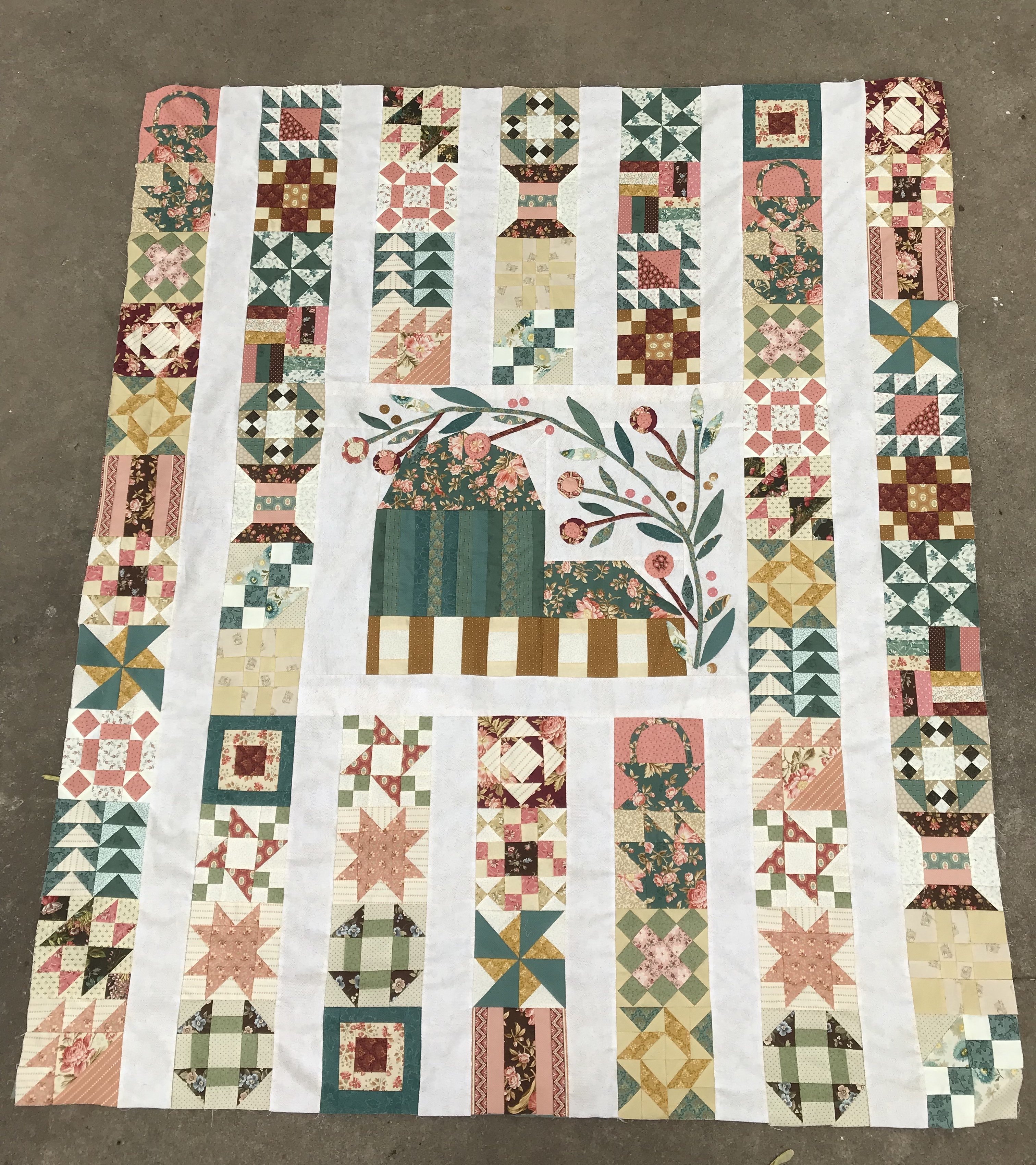 Completed piecing the 2018 BOM by Edyta Sitar. It is not quilted yet as I am relying tomdecide on borders. I am thinking of a 3 border quilt. Small beige border, then a slightly larger pink and finally a larger dark green. Suggestions?