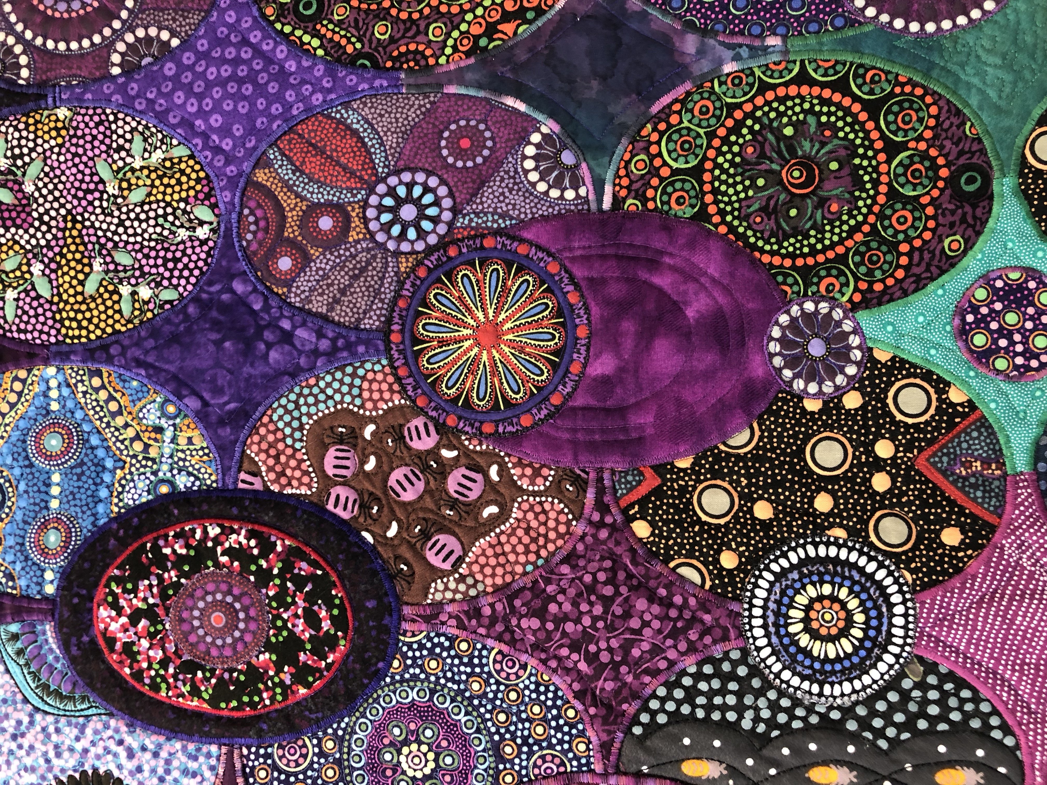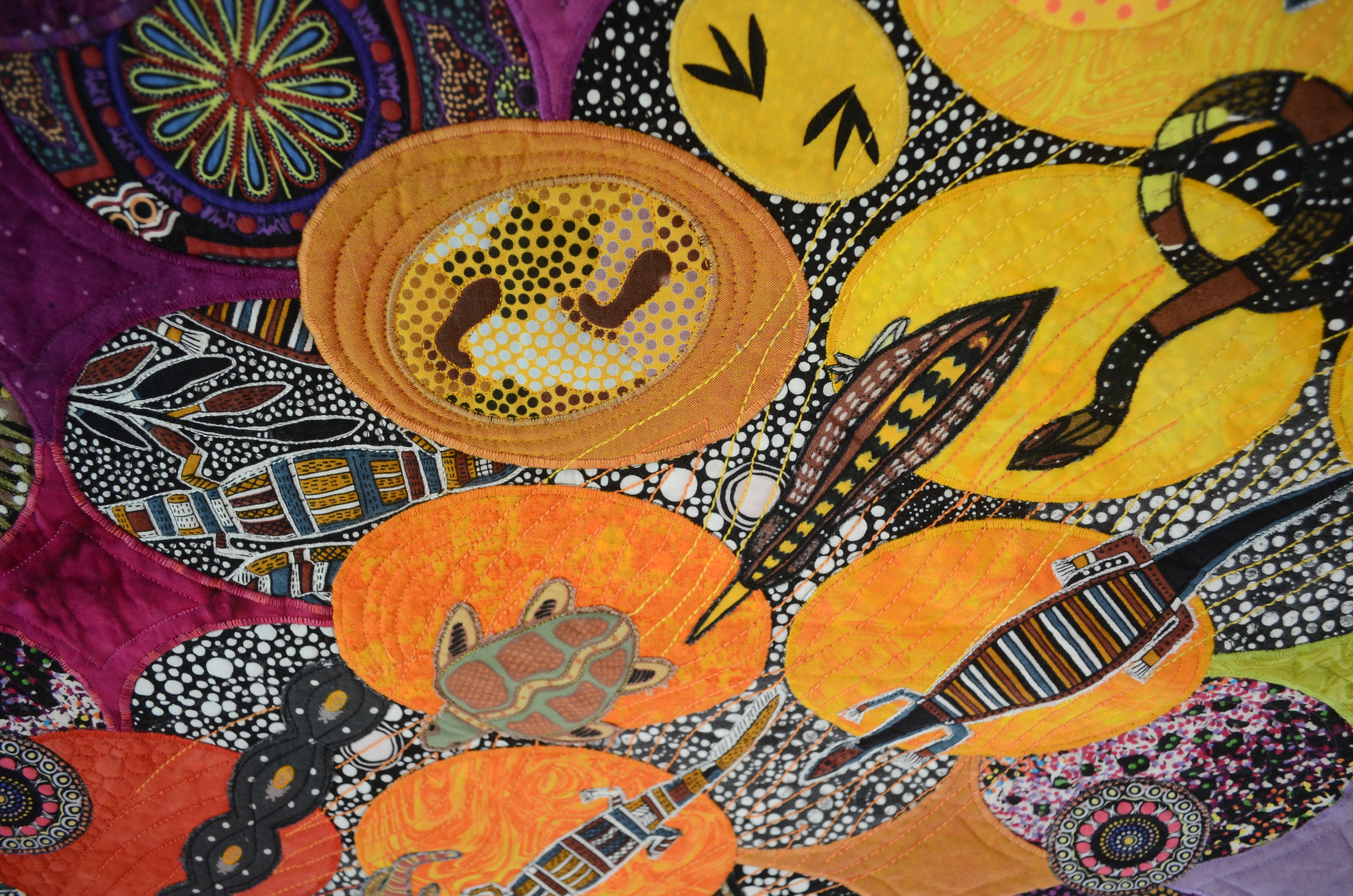 I began this quilt in a "Double Visions" workshop with Louisa Smith. I decided to rely primarily on my extensive stash of Australian aboriginal fabrics for the pieced lower layer and brightly colored solids and near-solids for the overlayer of X and O shapes. Then the animals demanded to be added to the diagonal "road" so they could get headed outback!