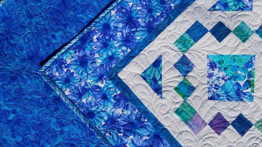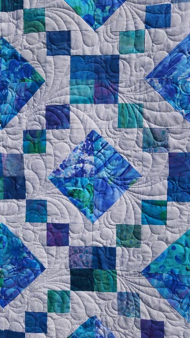 This is a Jewel Box quilt pattern using fabric from the Calypso fabric line for the half square triangles, and several batiks from my stash for the squares. It has a flanged binding. It was named Diamond Lake after a lake in Oregon where my family and I camped and my daughter had her first canoe trip. At the time there was a large gathering of square dancers and they put on an impressive and entertaining square dance in the parking area near the boat docks... thus the squares surrounding the diamonds. These happen to be some of my favorite colors and I loved working on it and watching it evolve.