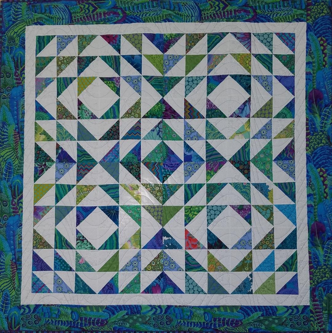 I purchased a charm pack of Kaffe Fassett fabrics and paired them with a variety of white tone on tone fabrics to make half square triangles. I sewed them together in a balanced square design, and used some beautiful Kaffe Fasset feather fabric as an outer border. I made a flanged binding using another Kaffe fabric. It is a simple design that I think shows off the variety of beautiful prints that he has designed. Ellen Abshier machine quilted it with dark blue thread.