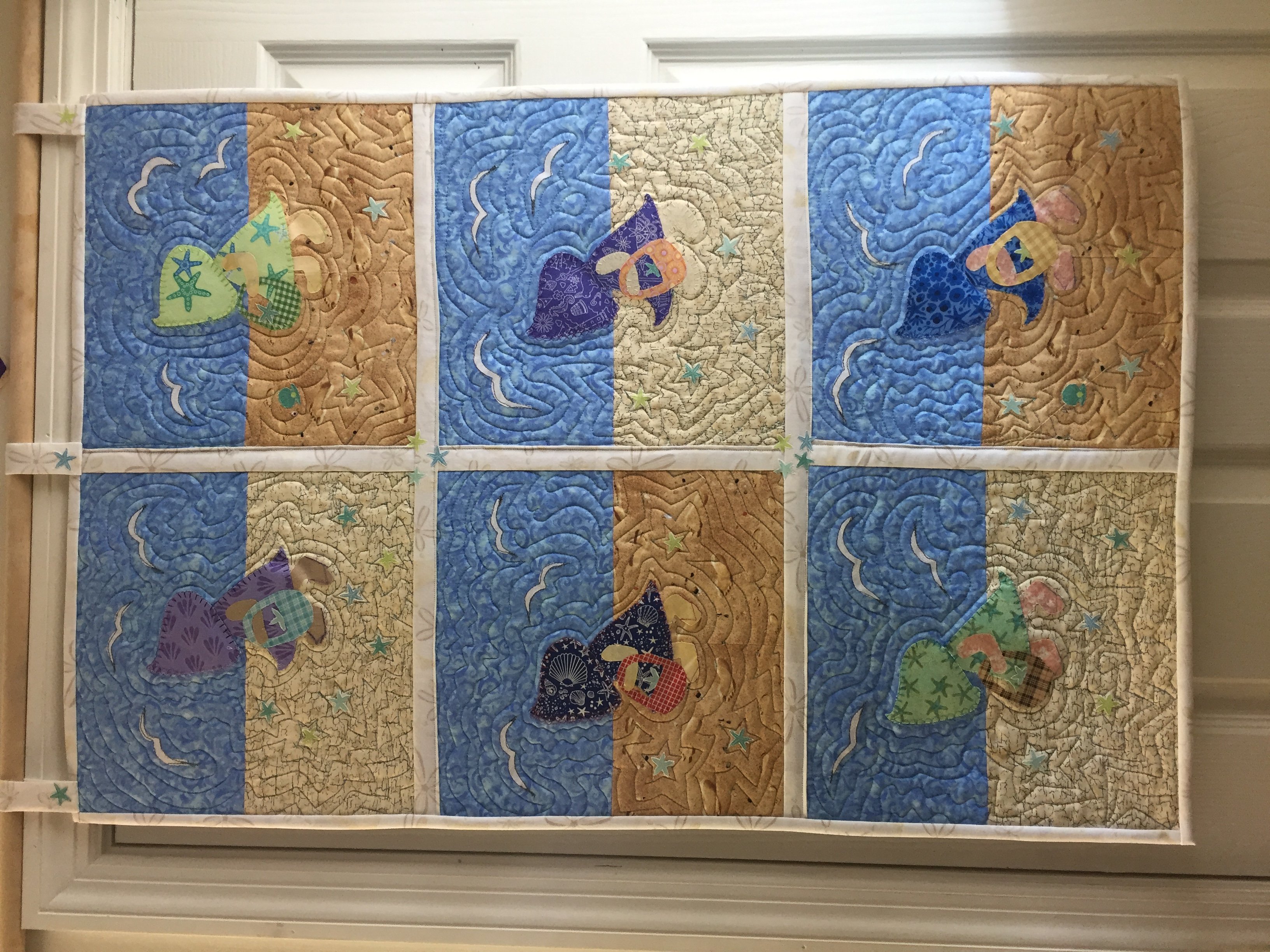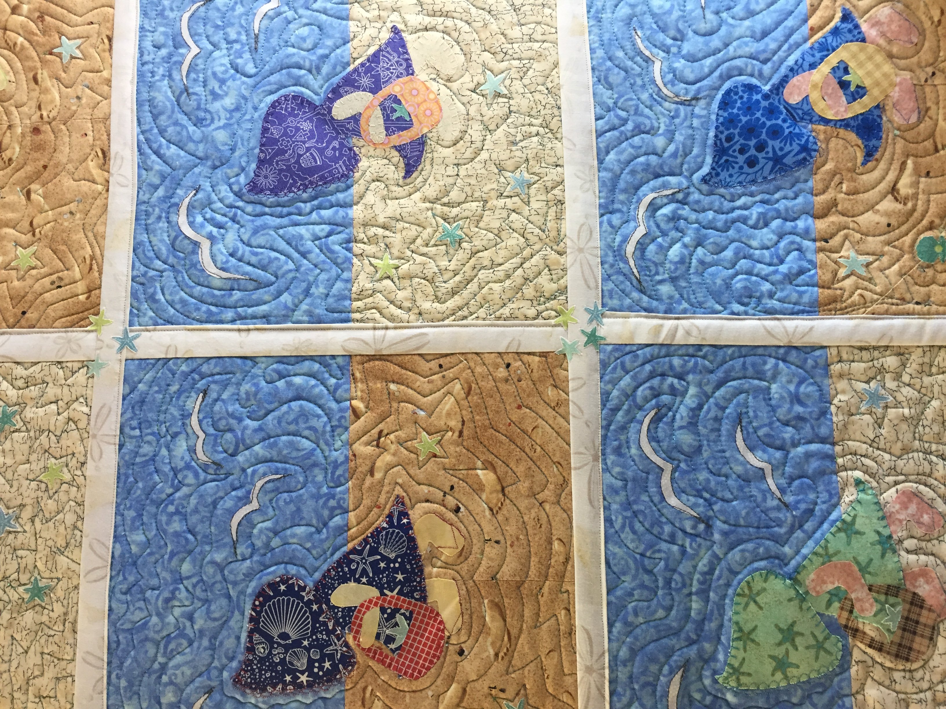 I've always wanted to make a sunbonnet sue quilt and I live in the Florida Keys, so this quilt was born. Since I could not find a tropical pattern for a sunbonnet, I took the opportunity to create my own design. I had just finiished a starfish quilt so had the fabric for the ones fused all over and for her outfits. It's like playing paper dolls again! This quilt was also QAYG practice which is a learning curve to keep your brain right side up. It's hard to see but the sashing and binding are sand dollars. Super fun to make, hope you enjoy! Don't know why my pictures are sideways!!!