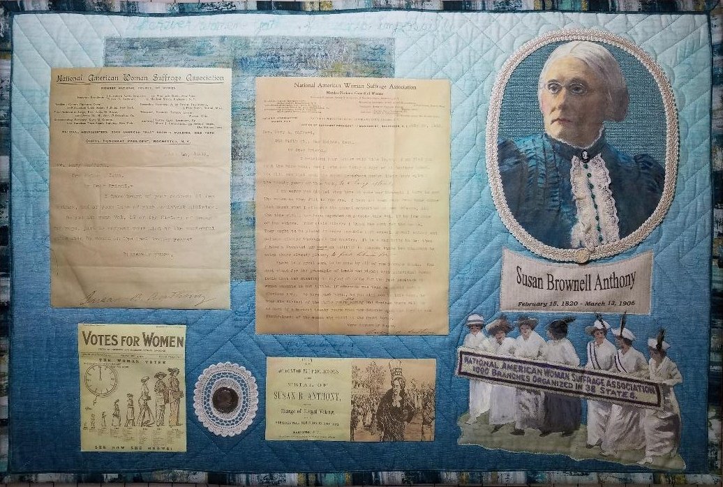 This was made as part of a quilt challenge that I co-chaired for my guild titled, "HERstory; Notable American Women" featuring American women whose accomplishments occurred in or while representing America. I have had an interest in Susan B. Anthony since I was in college and did research papers o her. In 1978 I acquired 2 letters found folded inside some old books that I purchased. The letters were on National American Women's Suffrage Association letterhead and were signed by Susan B. Anthony. I wanted to use copies of the letters on my quilt and feature aspects of Miss Anthony's life that she was known for in history. While working on the quilt one day, I was listening to the news and was alarmed at some of the sexist/misogynistic comments being made by some of our current politicians. I had been reading many of Miss Anthony's quotes and realized that some of them were just as relevant today as they had been over a century ago. There wasn't room to include all of the quotes that I felt needed to be on the quilt, so a decision was made to make the quilt double sided. The back side of the quilt contains a timeline of Susan B. Anthony's life as well as her quotes. I added embellishments including feathers (from my fly tying collection), vintage buttons from a friend born in 1920 (the year the 19th Amendment was enacted), and a Susan B. Anthony dollar given to me by one of my co-chairs. The title of the quilt came from one of Miss Anthony's well known quotes. The quilt is being displayed at the Susan B. Anthony Birthplace Museum in Adams, MA until Feb. 29, 2020, to be a part of the 200th anniversary of Susan B. Anthony's birth on Feb. 15, 2020. What an honor to be part of the celebration of this amazing woman's life!