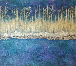 I was inspired by a Japanese fabric that included the trees and background fabric. The fabric had to be manipulated in order to make a level forest and I added additional trees in the forground. I added textile paint and inks on the snow and the rocks and used an ombre Stonehenge fabric for the sky and the water. The sky fabric blends with the Japanese sky fabric. I added rheinstones for the stars and it is quilted heavily with a Wonderfil Tutti variegated thread.