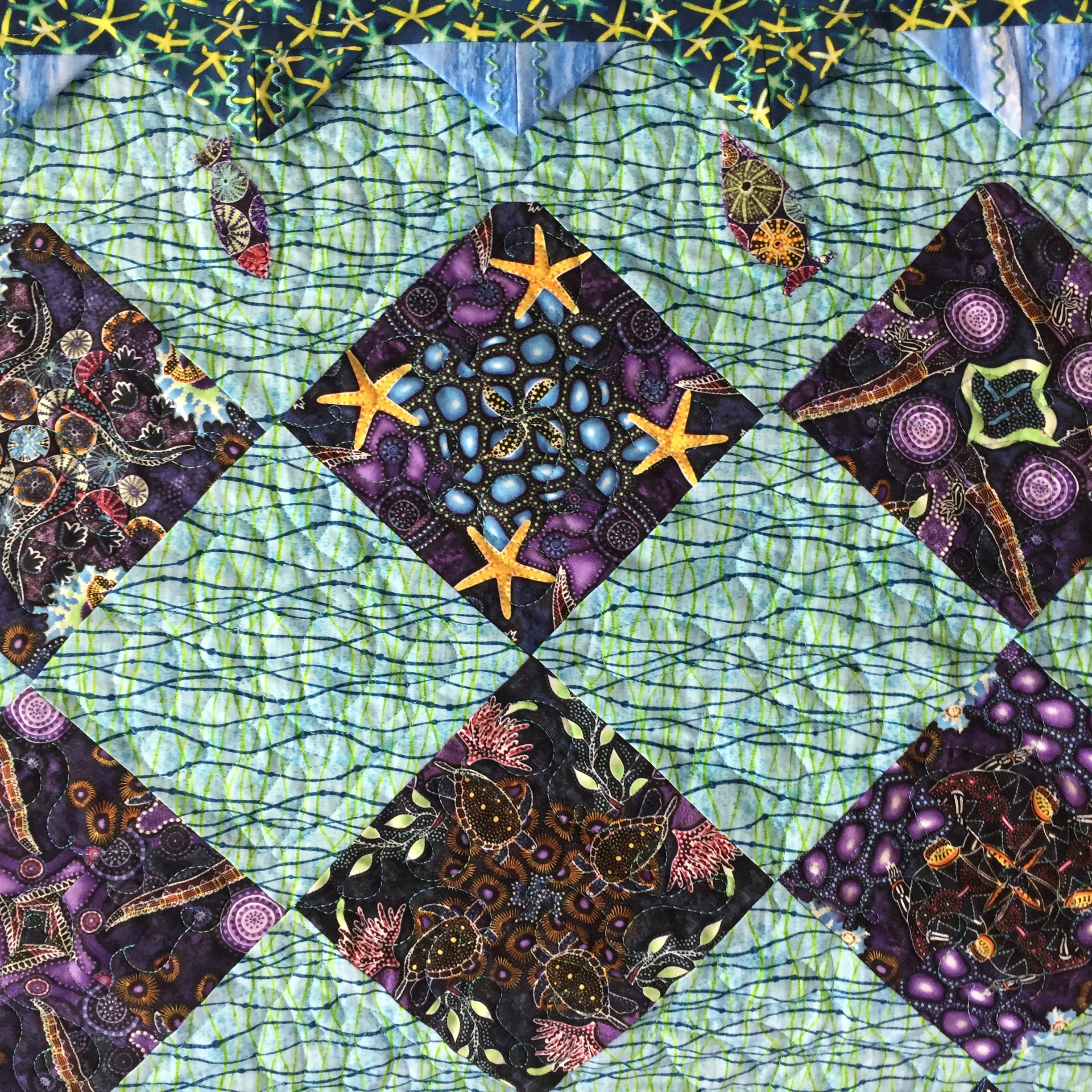 This fun fishie quilt is a combination of TQS techniques. First, I used Paula Doyle's method of easy stack to make the fabulous blocks then had to cut out the fishie appliques. Second, I used Susan Clevland's Prairie Pointer tool and techniques for the embroidered prairie points. When I free-motion quilted,I used Lori Kennedy's continuous fish design all over and I echoed the fishie appliques. The back is coral reef fabric so under this quilt you are definitely under the sea!
