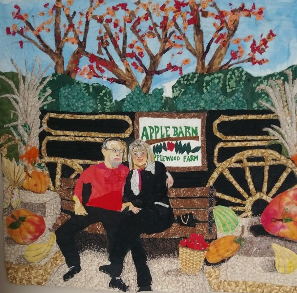 This picture was taken by a friend of mine.... Loved it at first sight. Enjoyed making this marker of a wonderful time for my friends. Currently this piece is with them. Raw edge applique, free motion quilting, beading, trapunto, painting,