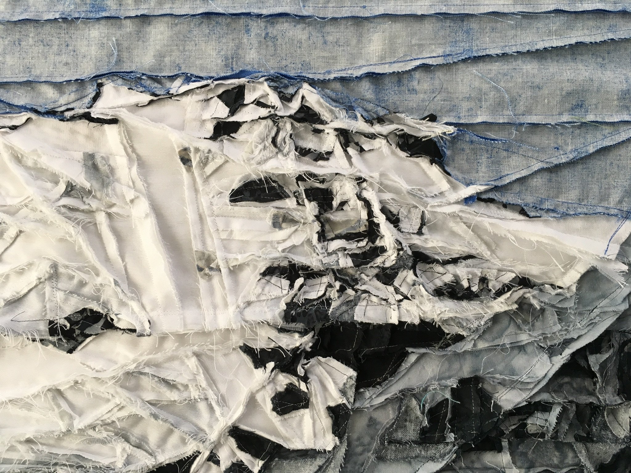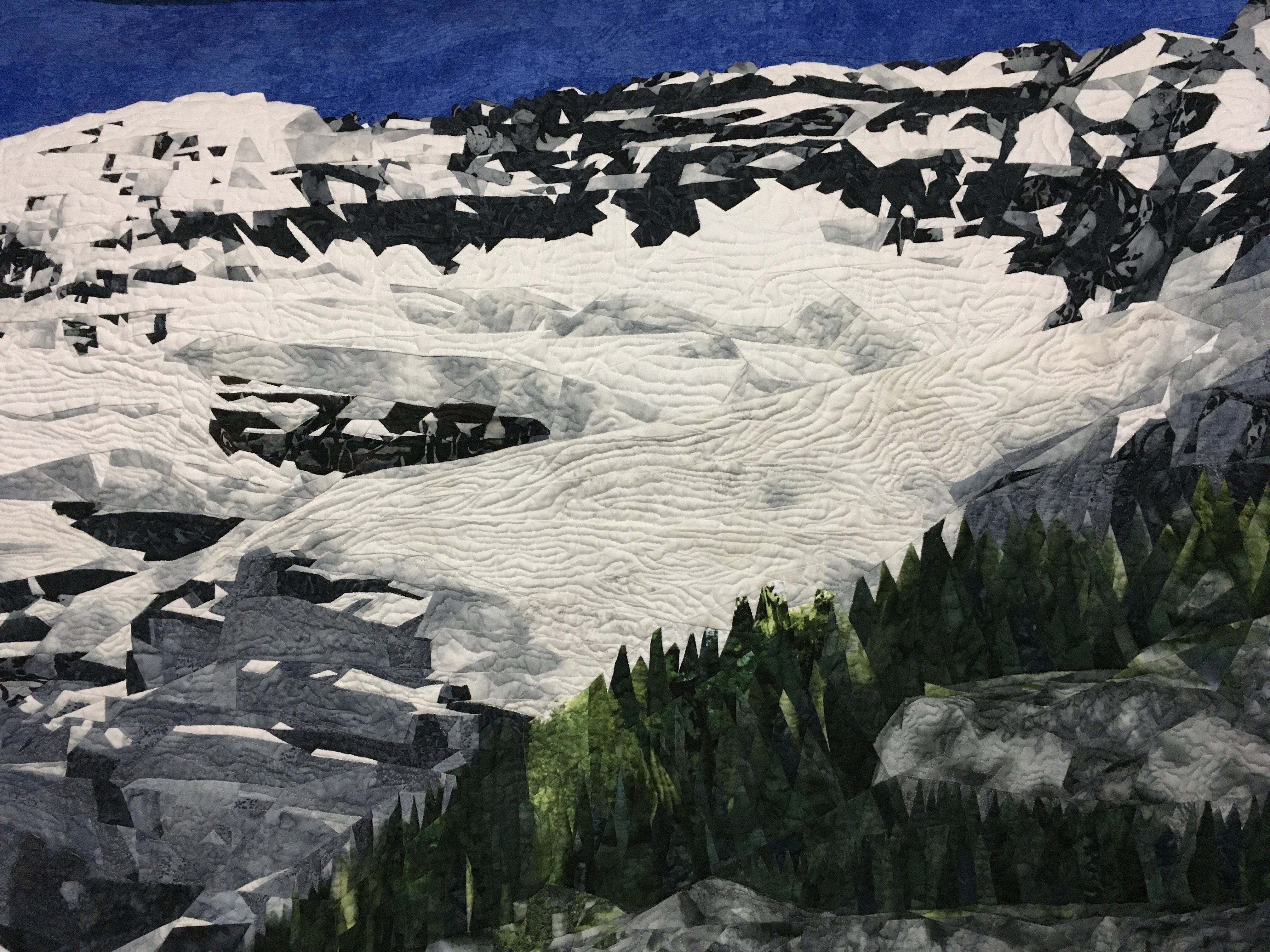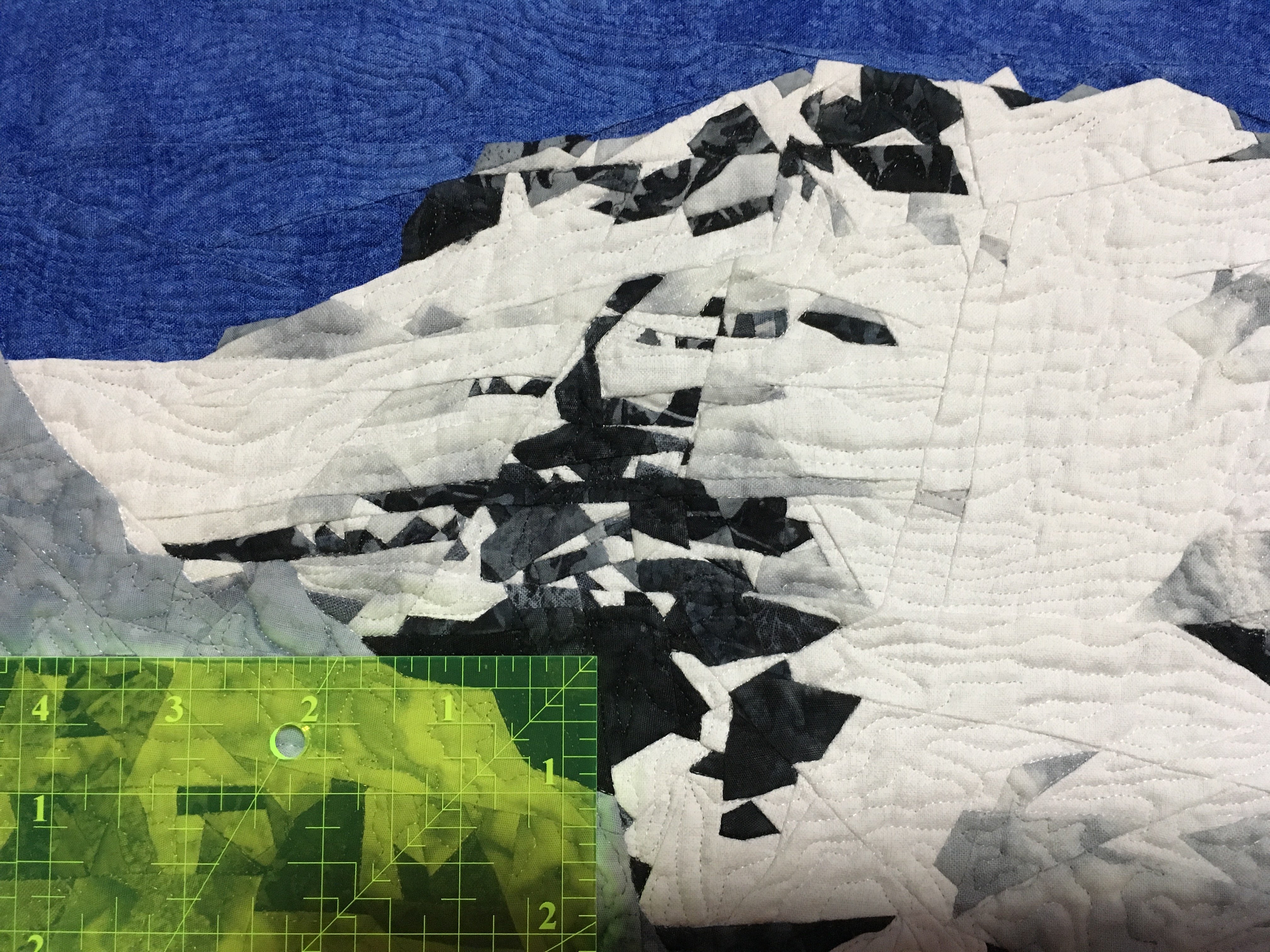I noticed one night that the reflection of the quilt in the window gave it a lot more depth and looks very different. There’s a photo of it in reverse on my blog fionaschiffl.com along with the more in depth story of the quilt. I also noticed an almost full sized face looking up in the rocks.