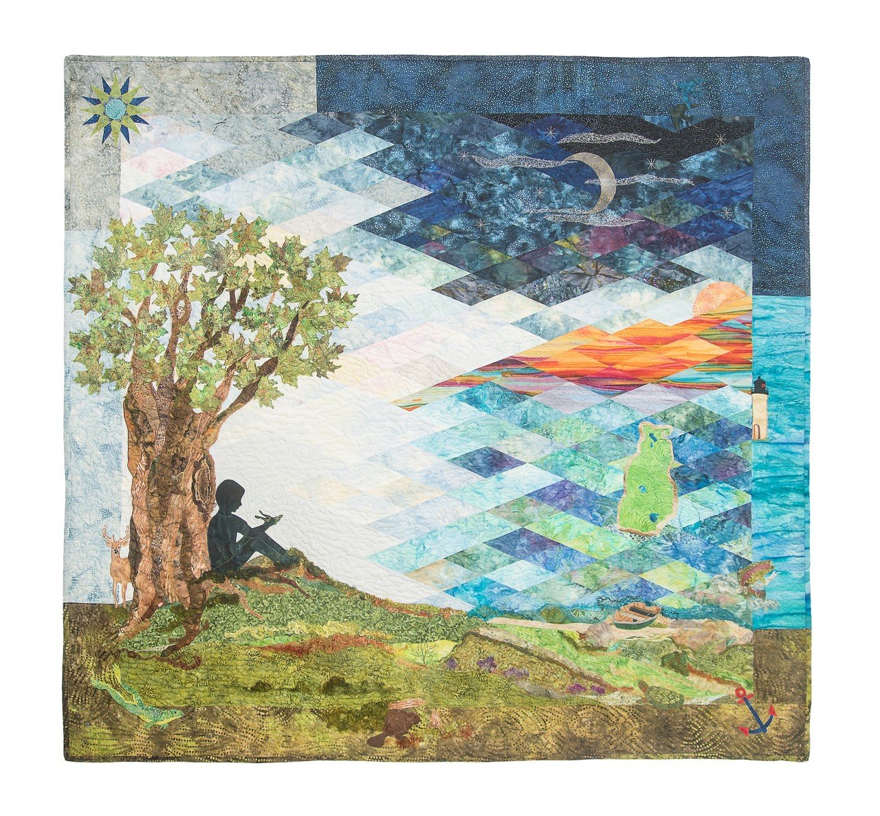 This quilt is for my grandson, Bruce. It shows a young boy sitting at home under a tree dreaming of all the things he loves about Beaver Island, in northen Lake Michigan which is his summer home. The image of Beaver Island is in the middle of the water and his favorite animals, activities, and all things Beaver Island are scatered around the quilt. The quilt was pieced, appliqued, thread painted, and embellished.