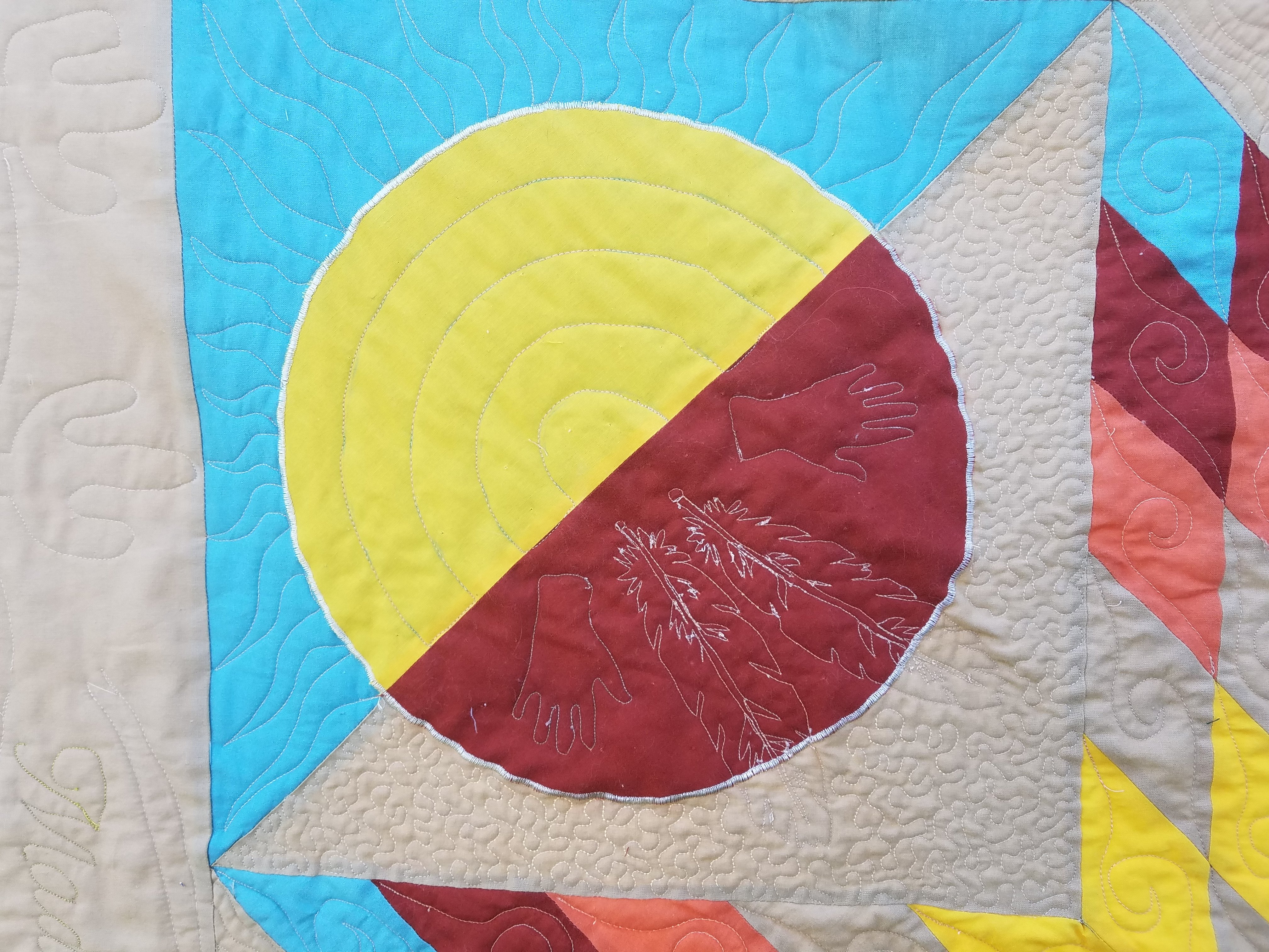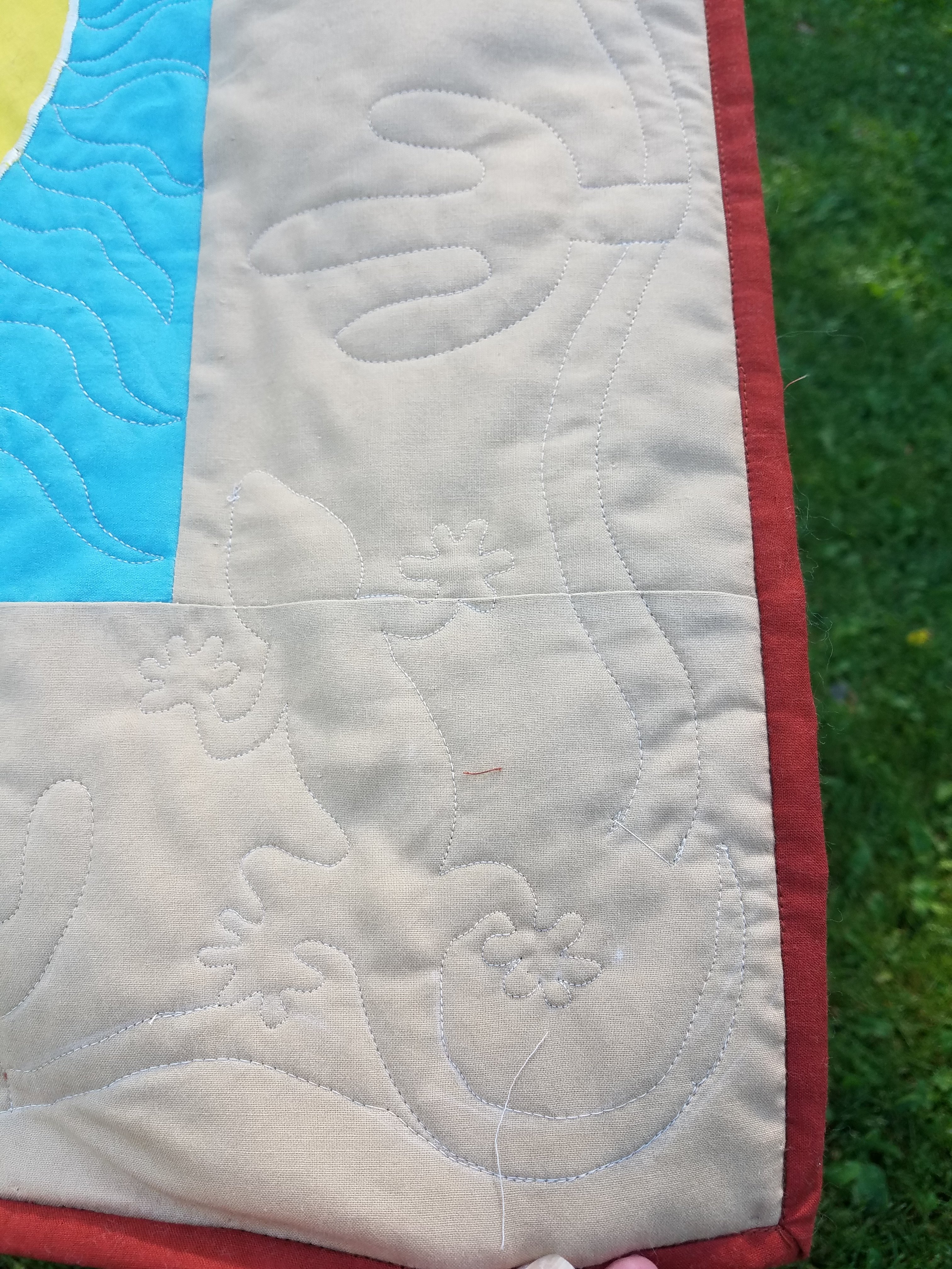 Baby quilt for our only granddaughter. The color choice was left overs from parents wedding quilt. As i was putting it together and was doing the outside corners, the quilt said that it needed something a bit different. So I went along with it's suggestion.... hence the spheres in the corners. I was trying to use up the "reminants" from the other quilt. I found a feather pattern online and traced the outline for design. I also traced my hand and sized it to fit. I also used some templates on the border. She was born in AZ and tried to keep to her birth place.