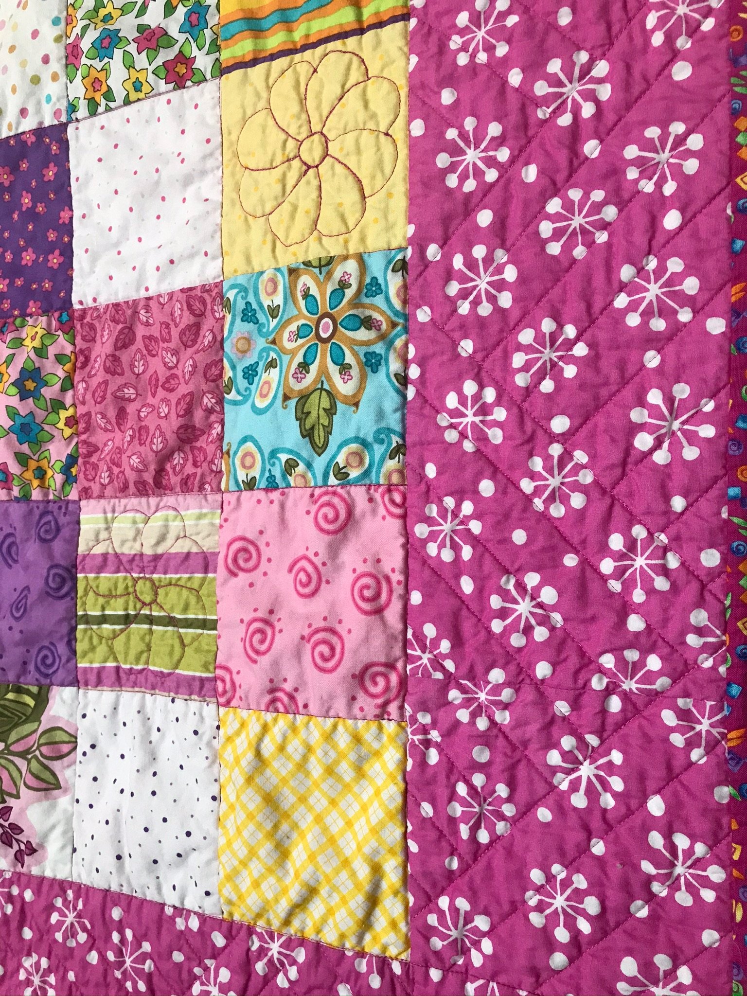 Combined most of three packs of charm squares I’d had forever. Stitched in the ditch and fmq’d flowers sporadically. Christmas gift for my 7 year old granddaughter.