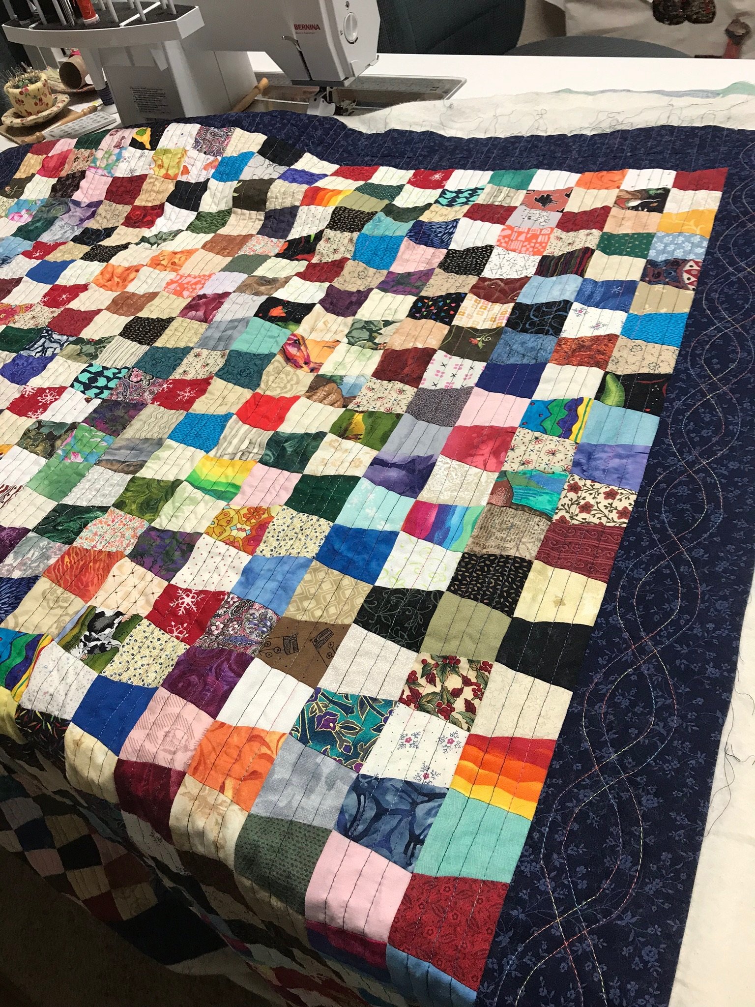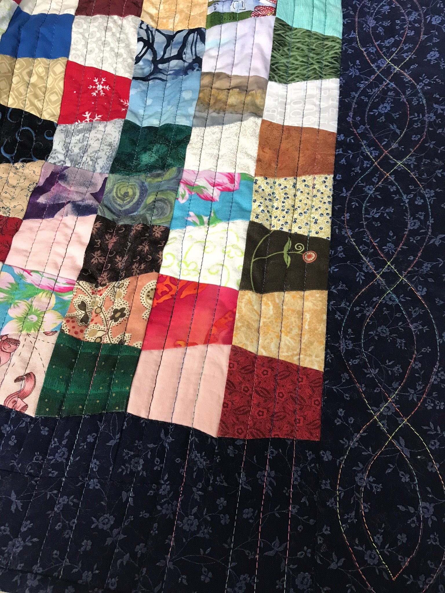 Made as a Leader/Ender project per Bonnie Hunter. Decided it’d be just right for my five year old grandson, so I put a cute barnyard print on the back. I’d been wanting to try straight line quilting for awhile, and chose a colorful variegated thread. Worked on the tumbler rows throughout 2018 and into 2019.