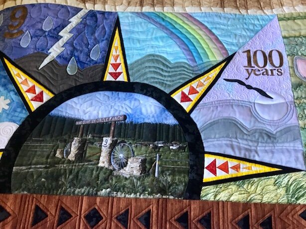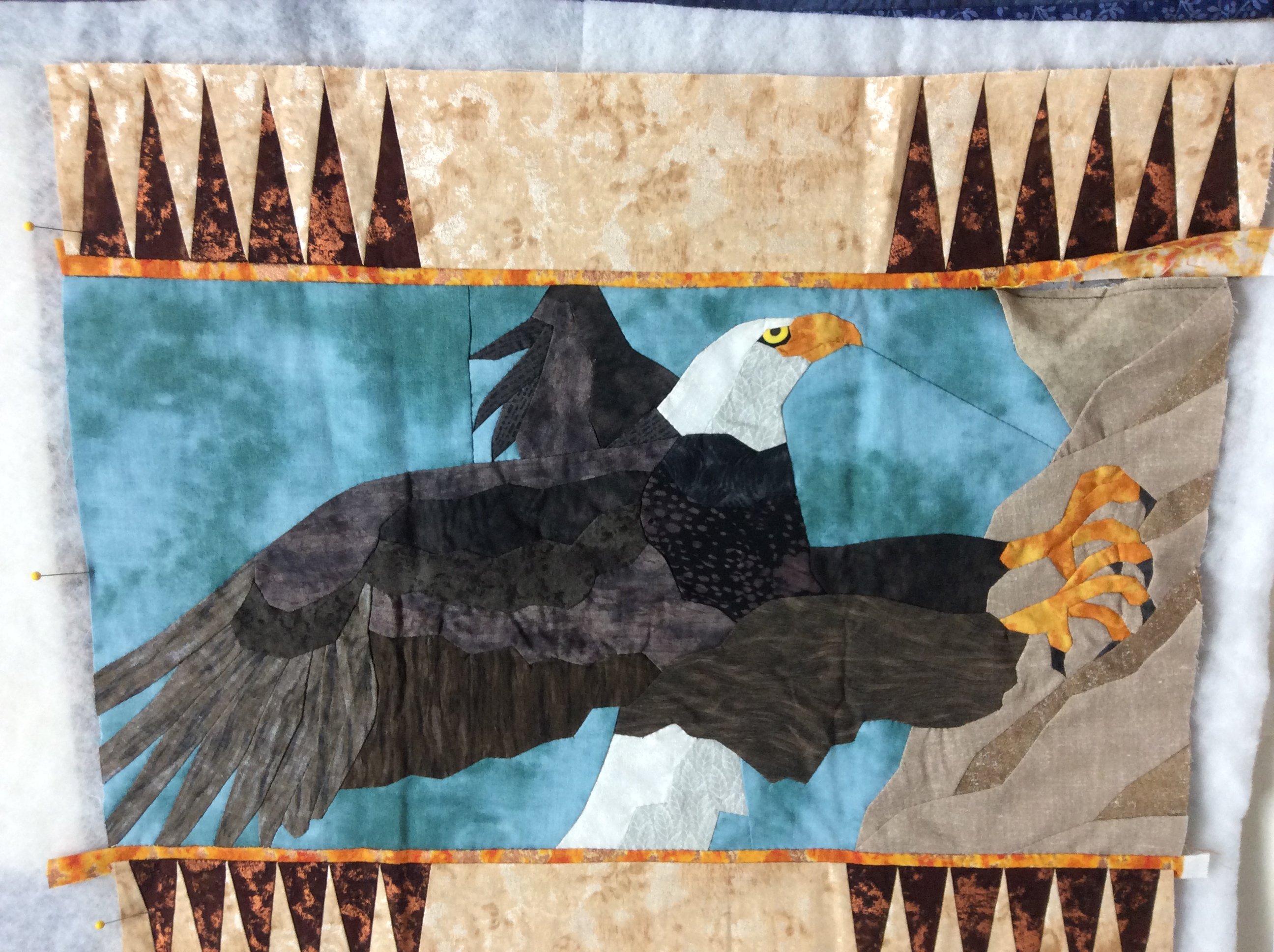 Started at a quilt retreat at a Montana dude ranch in 2004, finished on New Years 2019. Each time I went to the Nine Quarter Circle Ranch near Yellowstone, I started two projects, each taught in classes with Georgia Bonesteel and Charlotte Warr Andersen. A few I never finished, and some I finished independently. Then I got the idea to put several into one quilt...it turned out queen sized. Techniques included needle turned appliqué, fused and machine stitched appliqué, layered appliqué with wash-away thread, strip piecing, strip piecing with Grid Grip, hand piecing, paper piecing, etc. The hand-pieced eagle took years to finish, as I got frustrated working on the talons. One photo shows the stitching on the backside of the eagle. In early 2018, I put it all together and had it custom long armed by a talented friend. I finished the last stitches in the binding at the beginning of 2019.