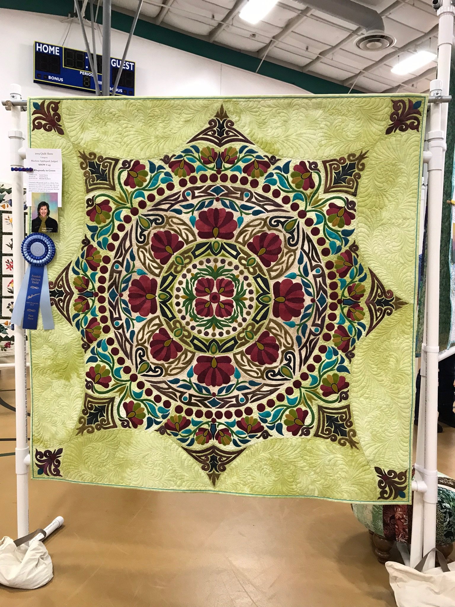 Truly a labor of love. I bought this fabulous kit from Ricky and changed out the background fabric for a very different look. So much stitching! I scheduled a couple of “at home” retreats over the summer and had my friends keep me company. Brandy Rayburn did her magic quilting and the result is pretty amazing. Finishing this project got me motivated to finish my first Rhapsody that I started 10 years ago in La Veta with Ricky’s guidance. And off I go again!