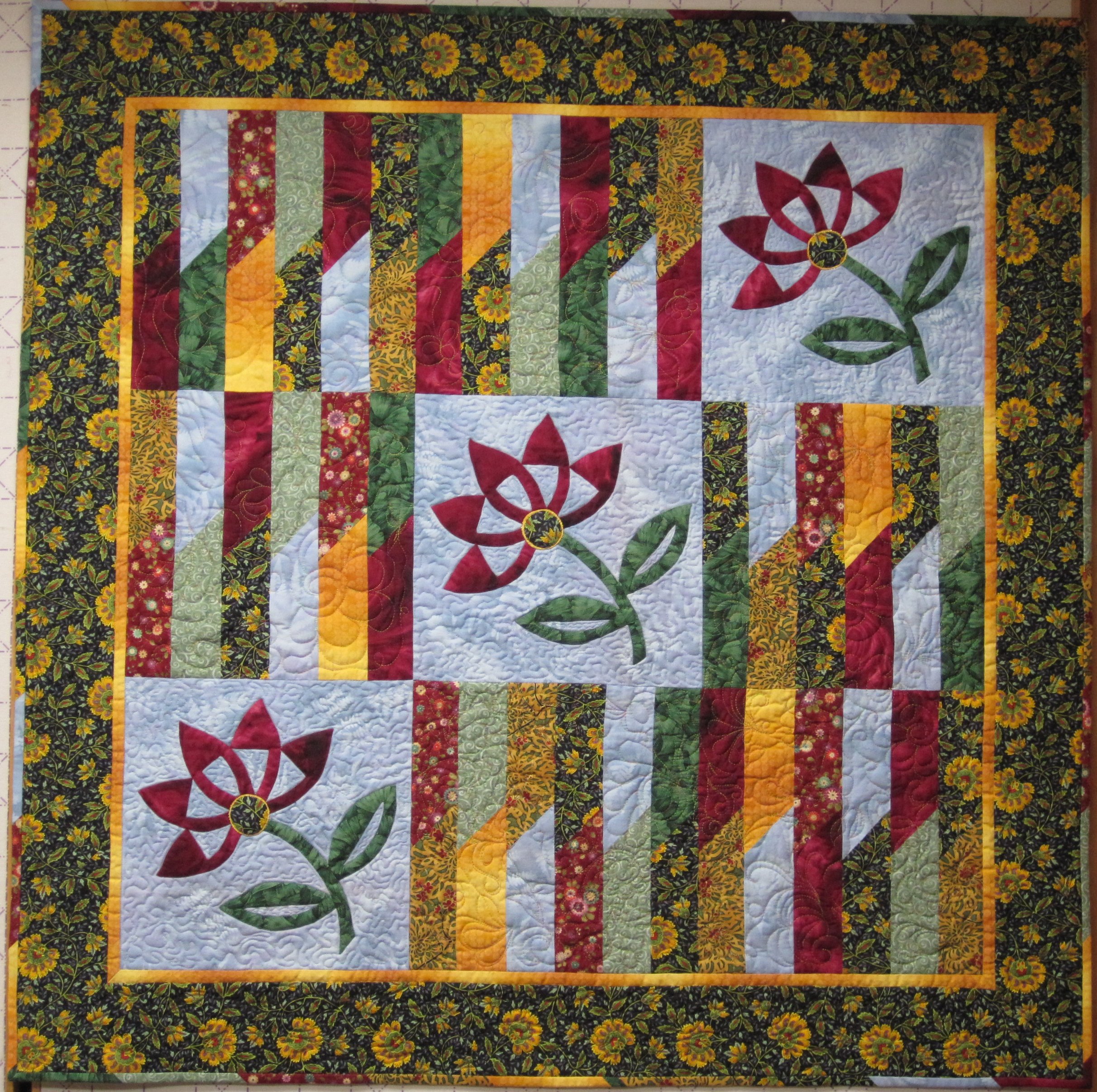 I hoarded the Turkish-style carnation border fabric for several years before I found the stylized carnation appliqué design in an issue of Quilts from Quiltmaker’s 100 Blocks. I modified the pieced part of the design and made this wall hanging for Mum’s birthday.
