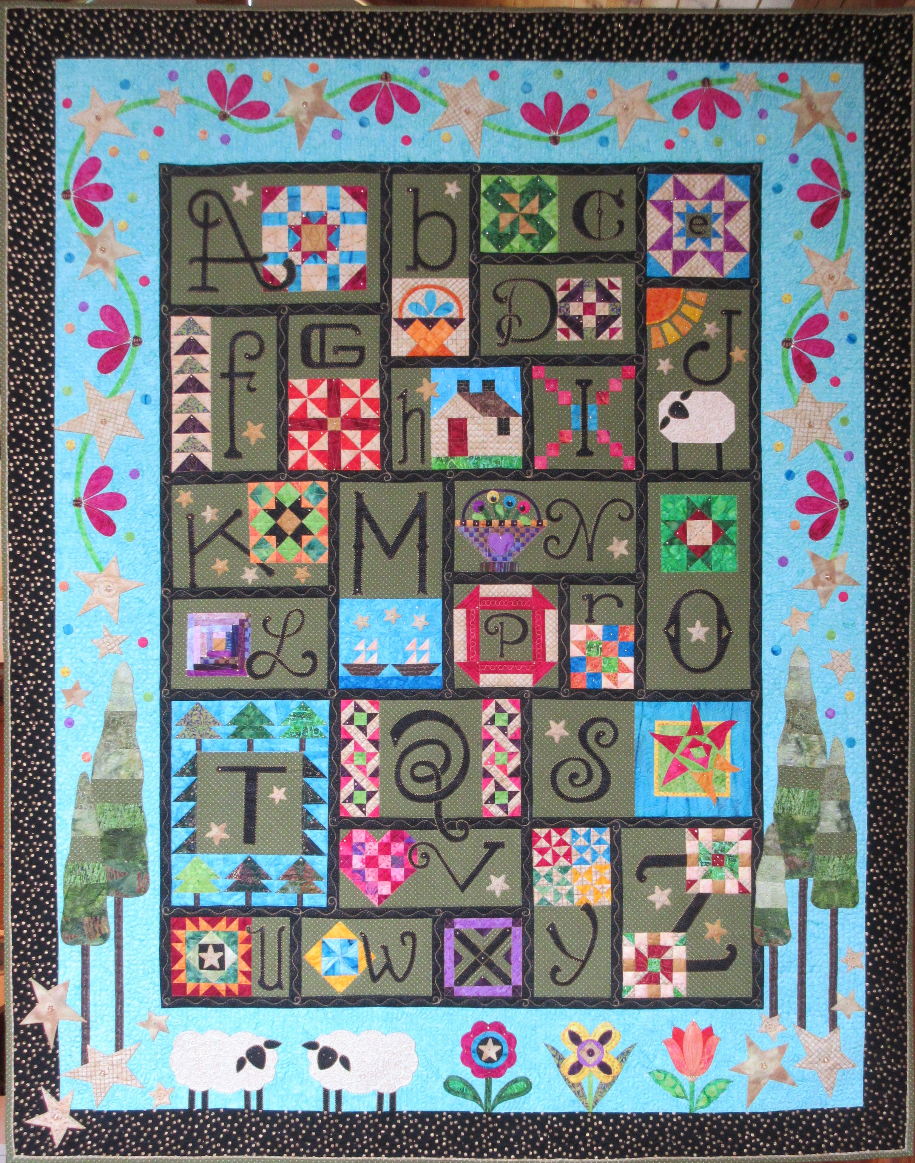 This was TQS BOM for 2014 designed by Janet Stone. I used an olive green polka dot fabric for the background instead of cream or some other light neutral. I machine quilted the quilt on my long arm quilting machine with blue, green, and black Bottom Line thread as well as accents in gold metallic thread all by Superior. Although barely visible, I quilted the entire alphabet in the outer black border. I added heat set crystals as accents to all the blocks. Each letter of the alphbet has a crystal, too. You can see more details on my blog at https://quiltsbyjoyce.blog/2016/08/31/a-to-z-for-ewe-and-me-completed/ .
