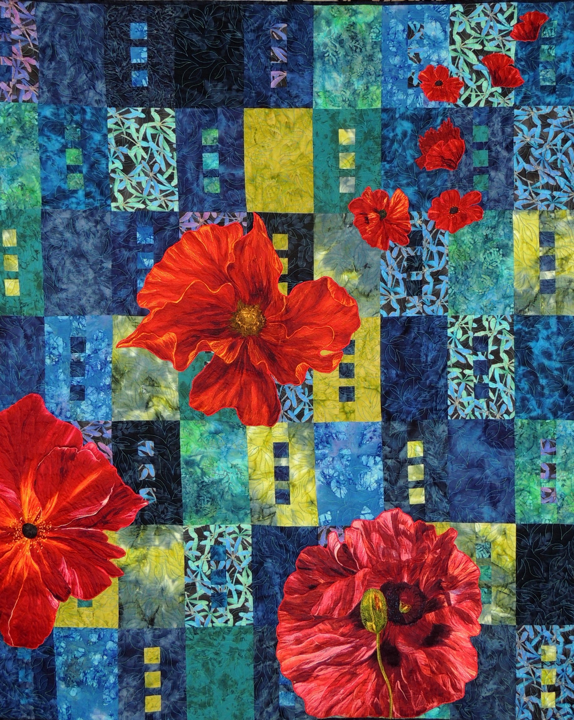 Made by thread painting each flower from Frond Fabric and applique them onto the pieced quilt using the pattern Zen. from Blue Underground.