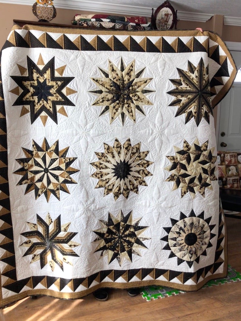 2019 Block of the Month by Becky Goldsmith. I chose black gold and beige for my colours. I chose not to do the applique border but the optional border.I quilted it it on my Simply Sixteen longarm