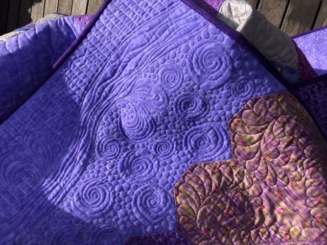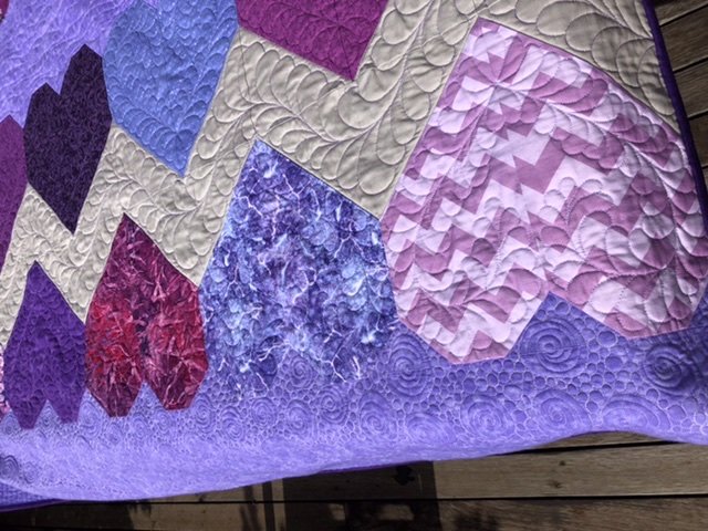 Tula Pink's Paper Hearts quilt design from the book 'Sew Red', made in purples as a wedding quilt for my purple-loving daughter-in-law. Free motion quilted, including fearhered hearts in each of the heart blocks.