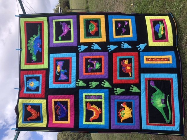 Uses a dinosaur panel, cut into its constituent pictures, each framed in bright plain homespun and sashed in black.