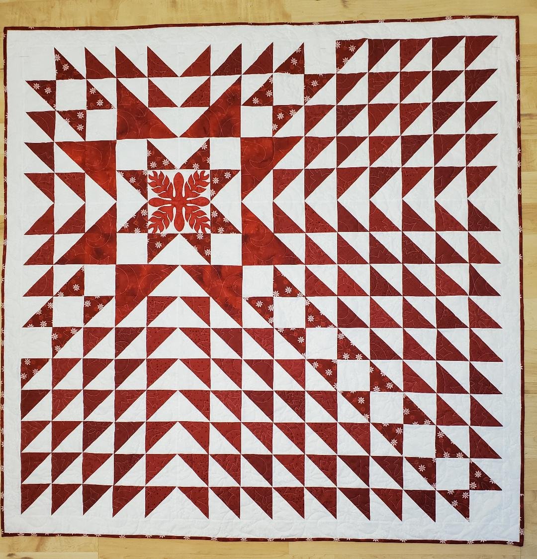 Using a photo I had seen of a Christmas Star quilt, I decided to make my own with some red fabrics in my stash and improvised using a Hawaiian applique inside the center star. After 40 years of quilting, I finally have my own red and white radiating star quilt that can be used throughout the year and not just at Christmas. It was machine quilted by Ellen Abshier of Cottonwood, CA using a snowflake design.