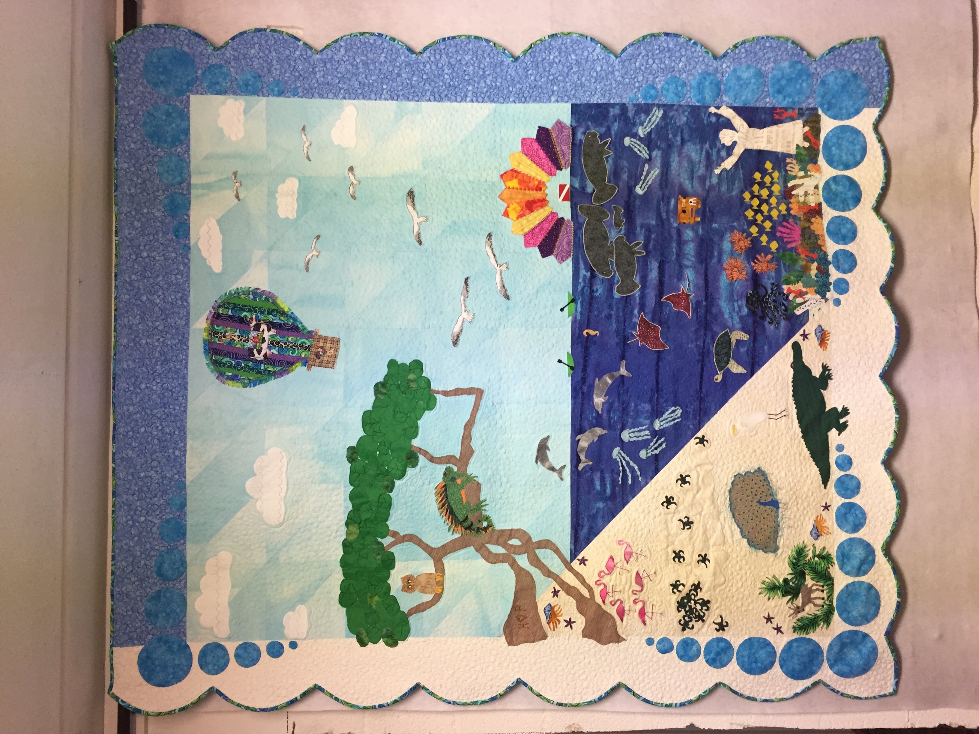 This is my masterpiece that was completed last year so it could be entered in AQS shows, first time entering,not accepted anywhere. Our Florida Keys Quilters guild was going to have our show on the 21st and 22nd but of course it was cancelled. Luckily the judge from Key West saw and judged our quilts on the 10th so I actually got comments for the first time. Now it is on display at our computer store in Tavernier and I wanted my TQS family to see it finally. I threw every ting I know on this quilt and it was very fun to make!