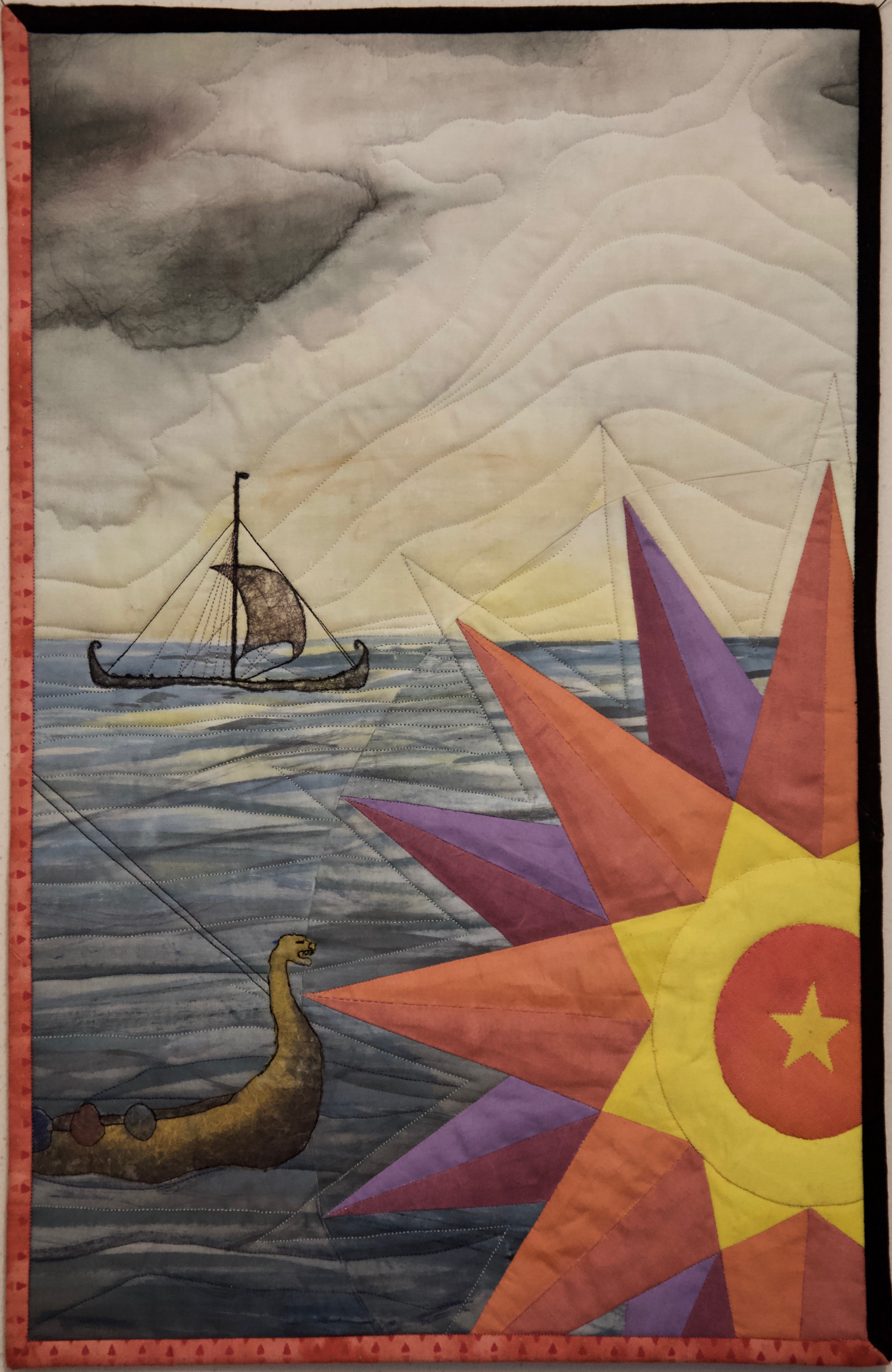 This was made for the Suitcase Collection of the Contemporary Quilters Groups of the QGBI. The theme was On The Road.For most of human history the easiest way to travel was by sea, as roads, where they existed, were often rutted and muddy. The Romans, who actually could build land roads, even called one of their trade routes the Via Maris. Some travelled to a new life, some to trade or steal and later just to see the world. The 2 vessels are Viking Dragon ships.