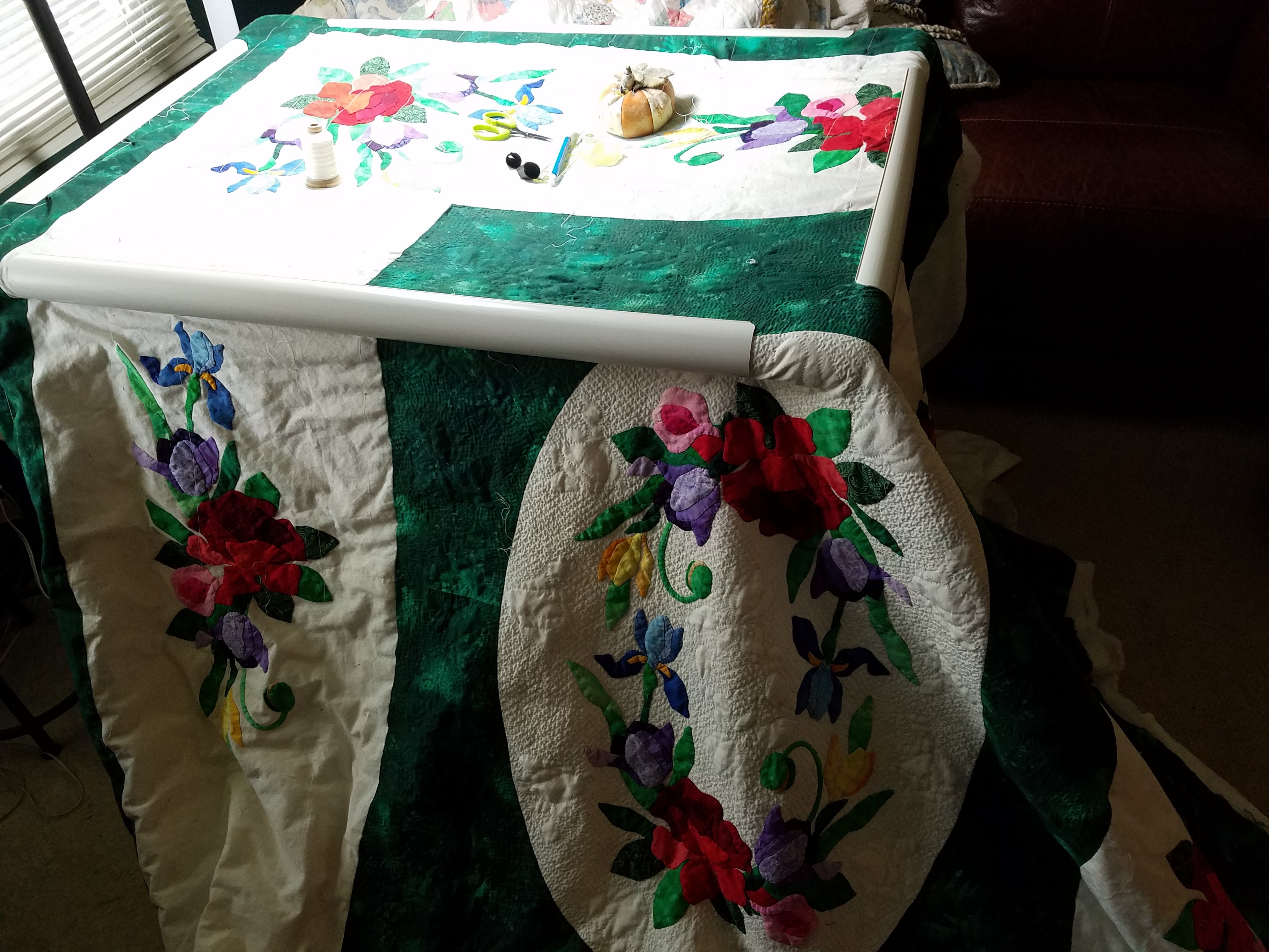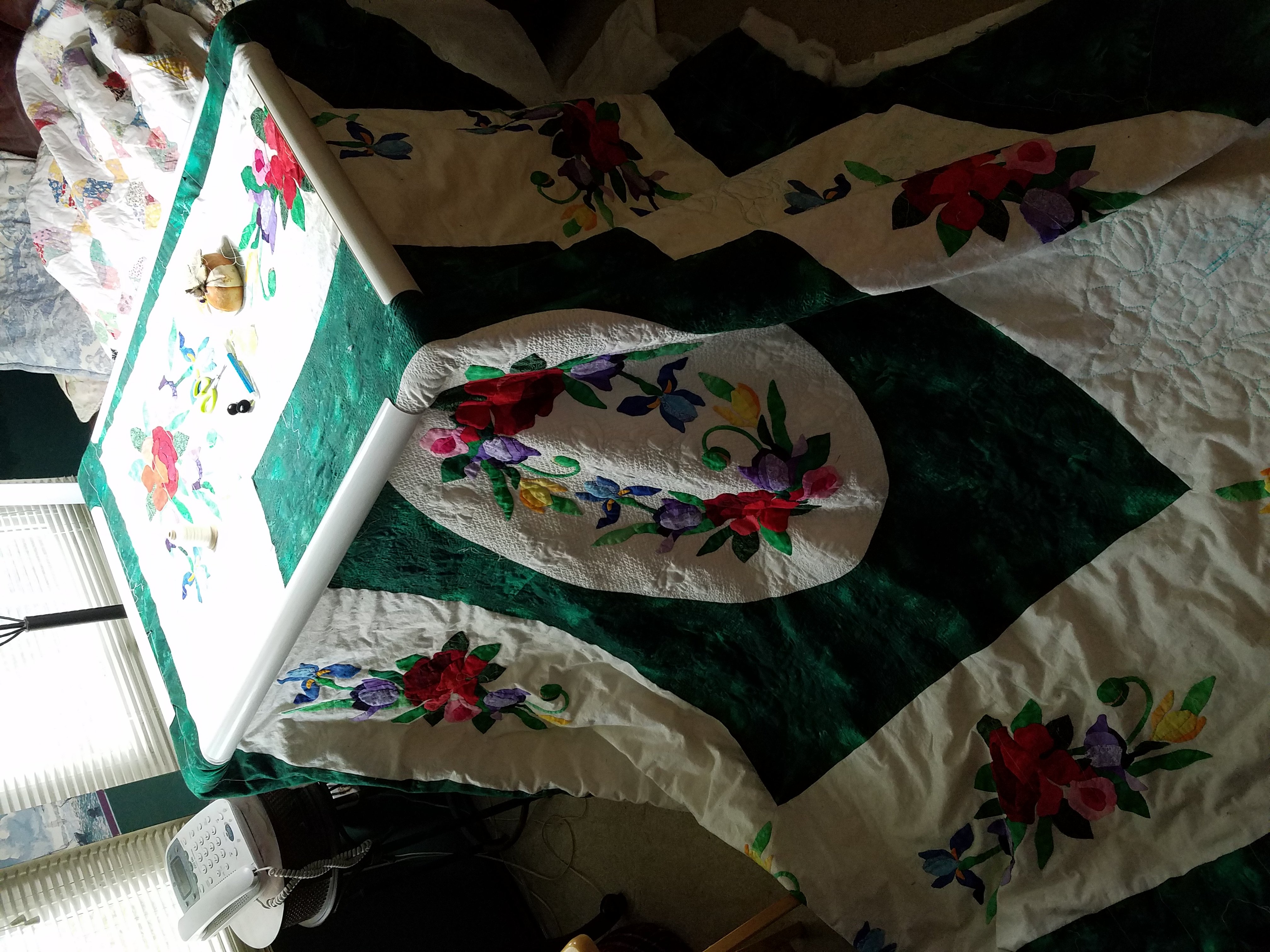 The quilt was originally started about 20 years ago, and after completing about 2/3'rds of the appliques it had to be set aside and was placed in storage for many years. Two years ago I rescued it from storage and started working on it again while my husband was undergoing chemo. I had completed the applique and the quilting on the center medallion and about 1/2 of the innner border when once again it was set aside when my husband died.