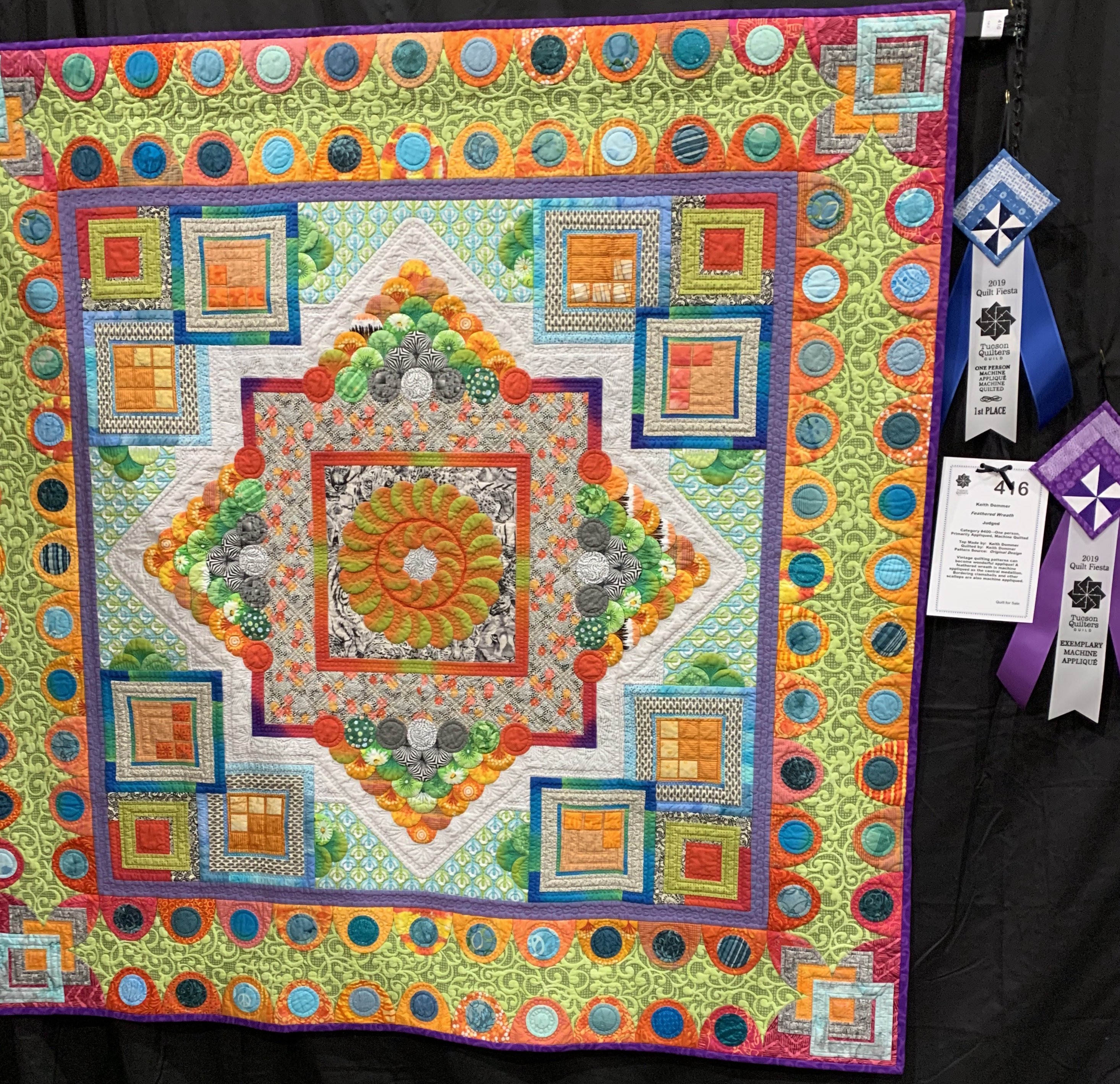 Feathered WreathVintage quilting patterns can become wonderful applique! A feathered wreath is machine appliqued as the central medallion. Bordering clamshells,other scallops, and squares are also machine appliqued.