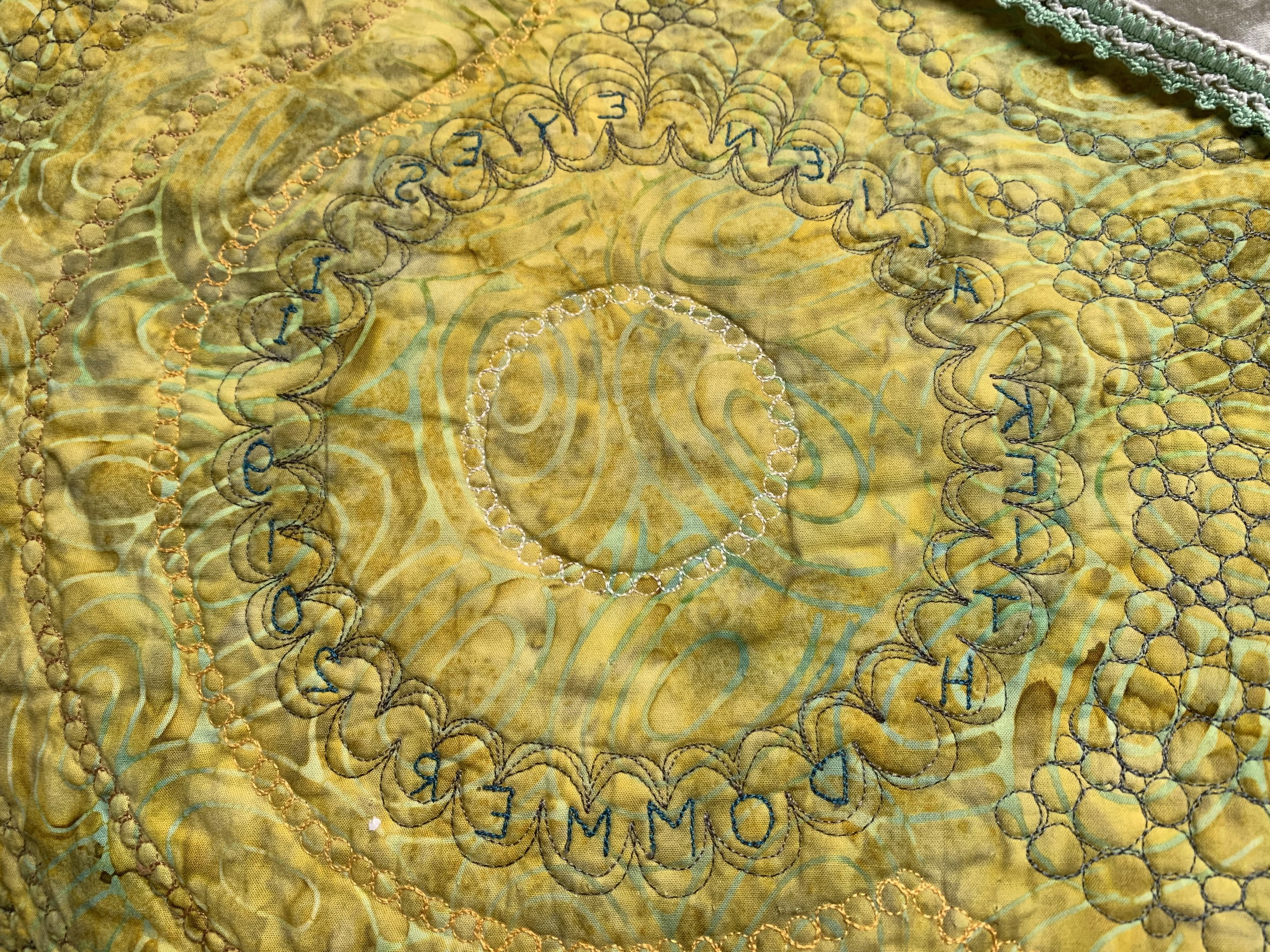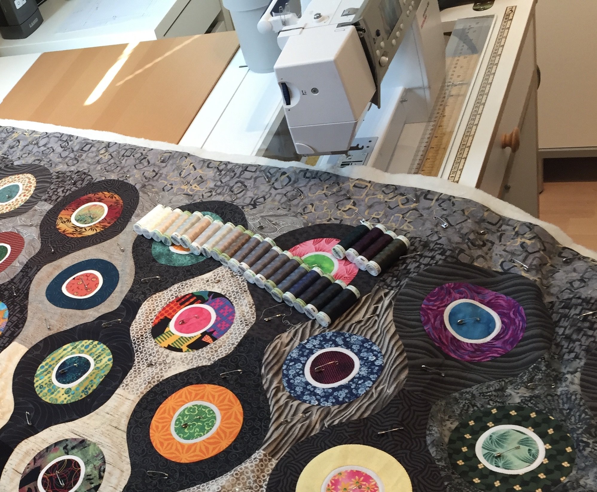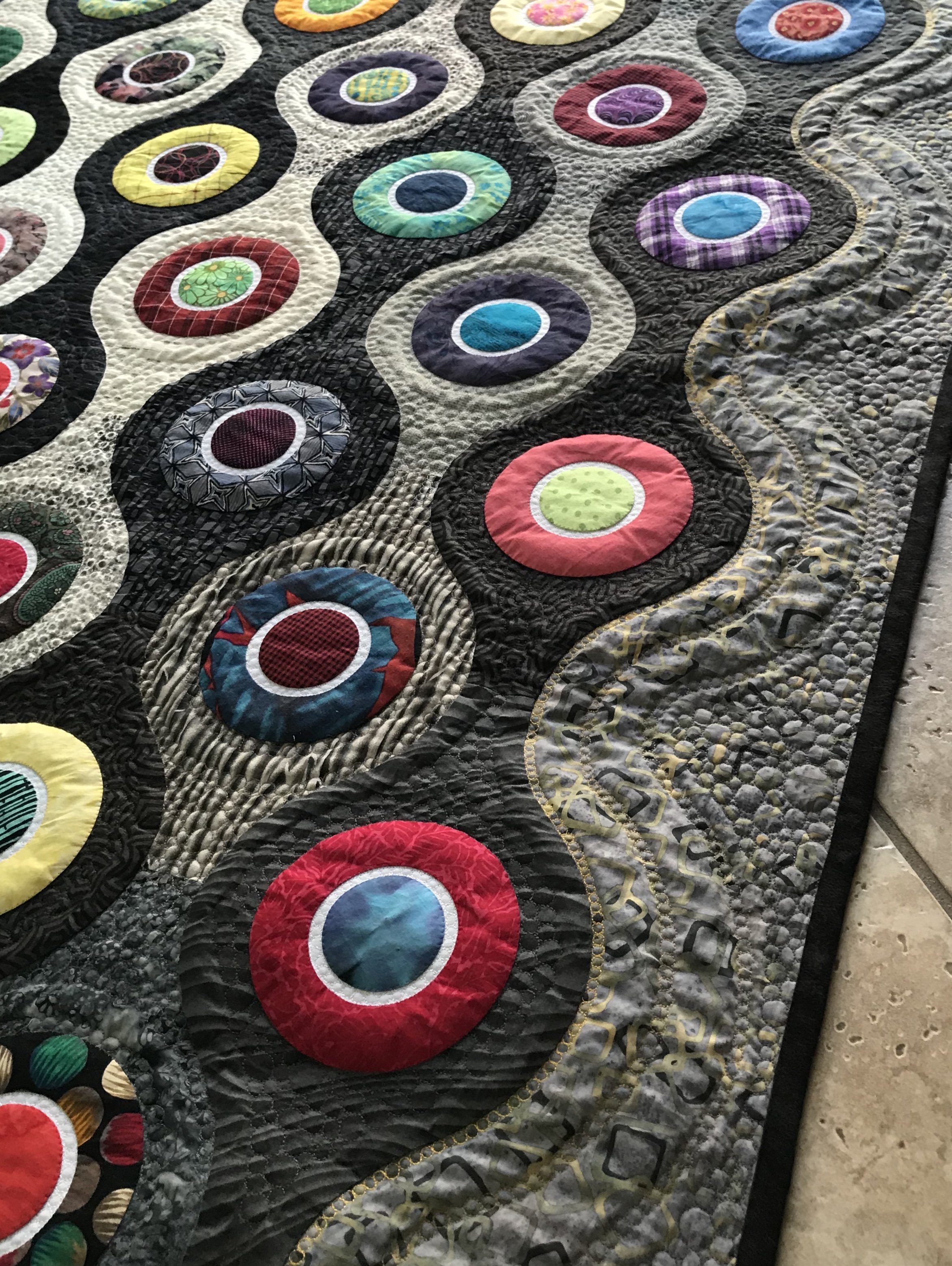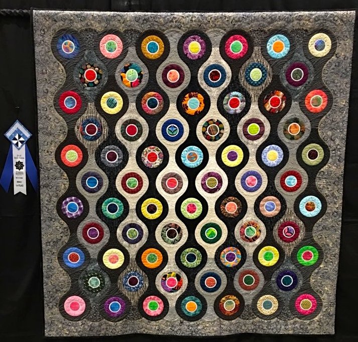 Inspired by lantern-style interlocking tiles, Alien Eyes II was machine appliqued from colorful scraps and machine quilted. Alien Eyes II took first place in the Modern Quilt category at the 2019 Tucson Quilters Guild annual show Quilt Fiesta!